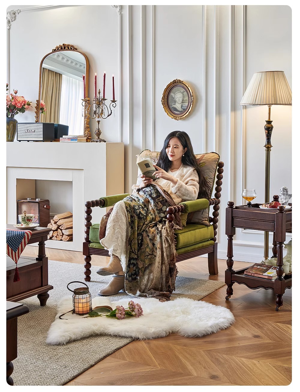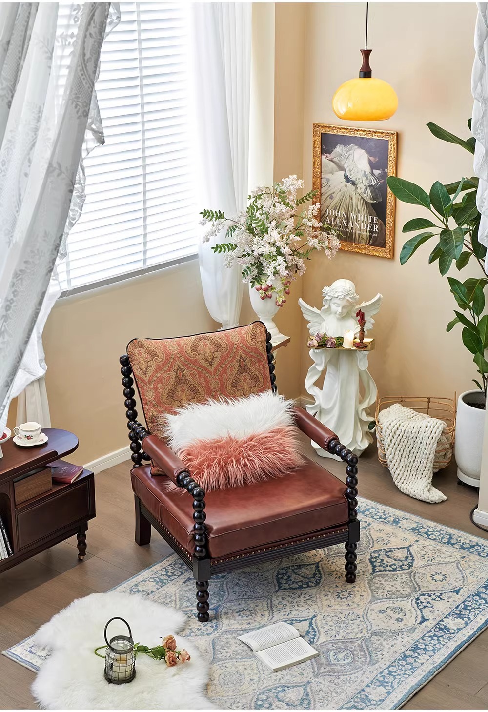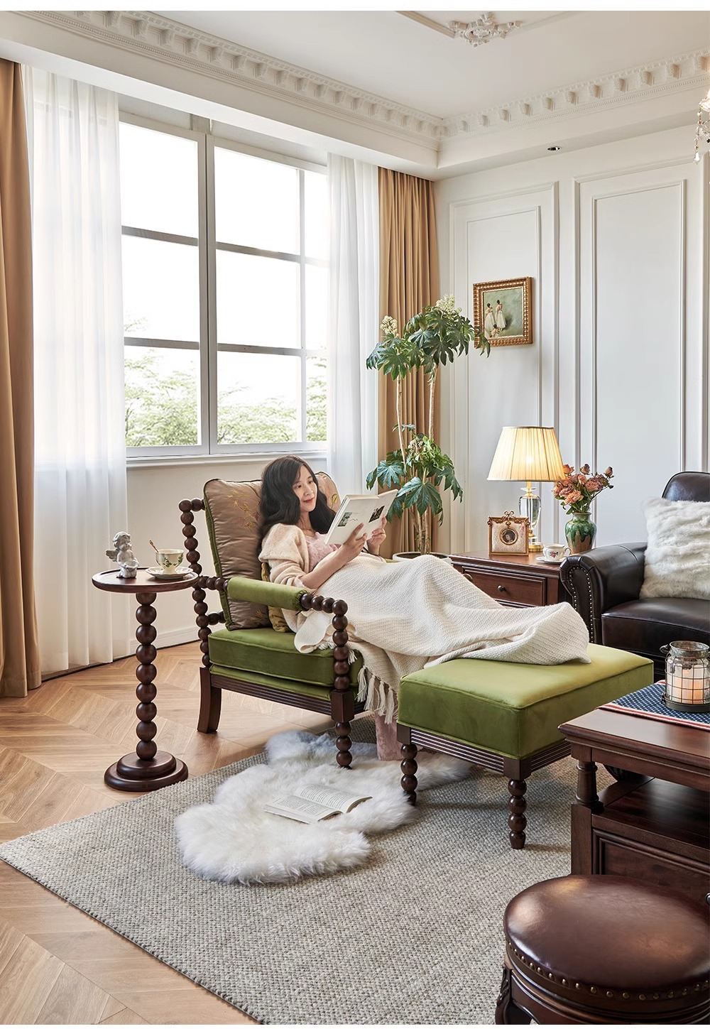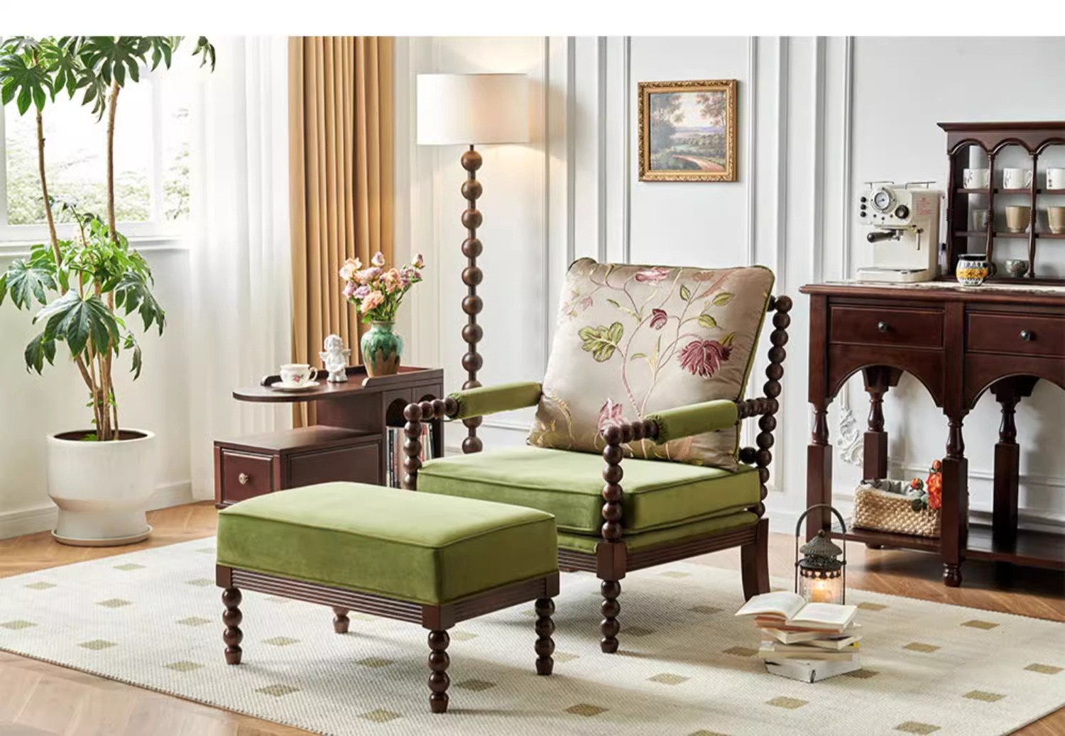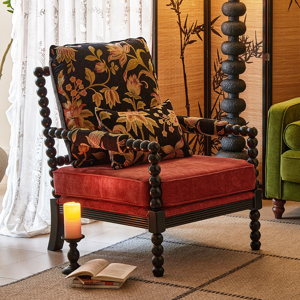 珍珠椅美式复古实木布艺单人沙发法式中古风客厅休闲椅子繁花扶手