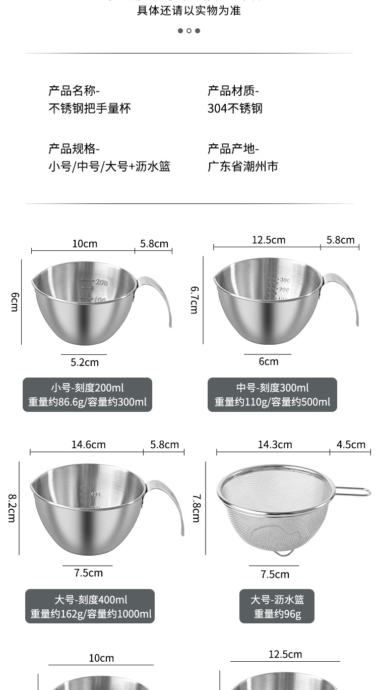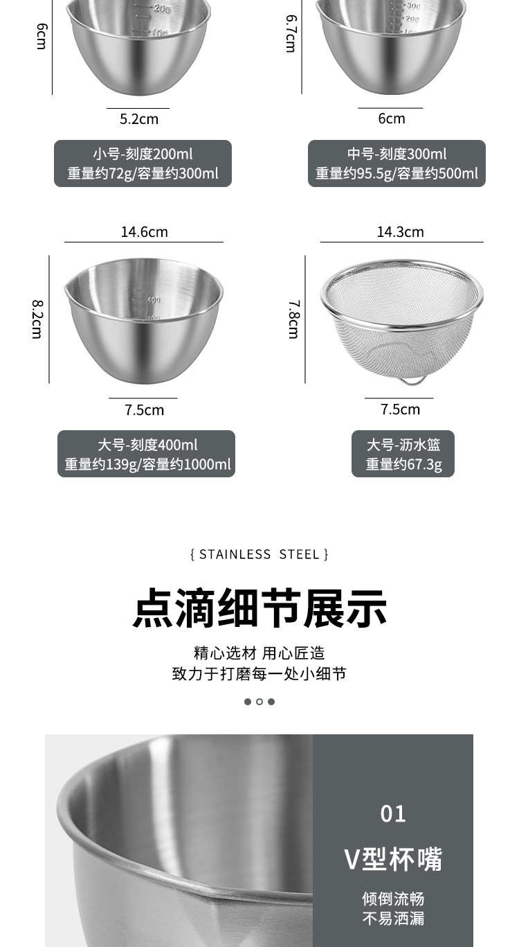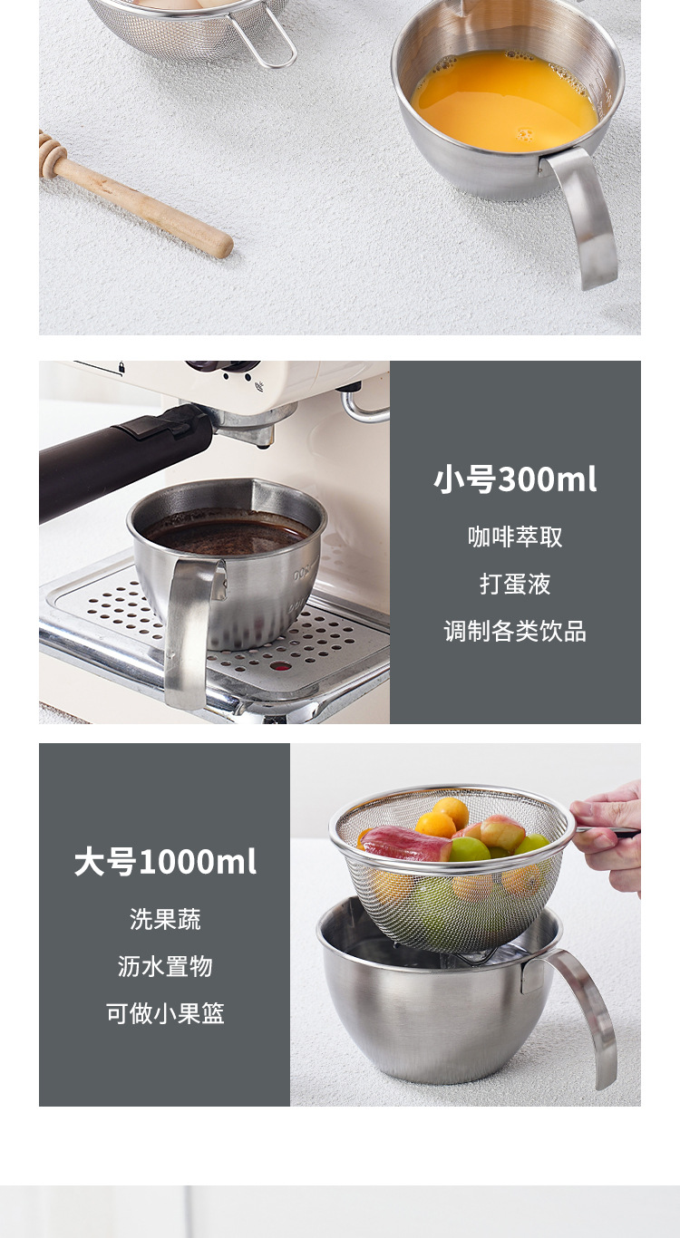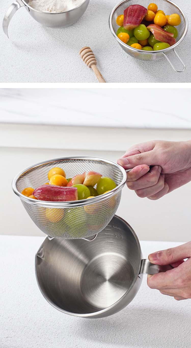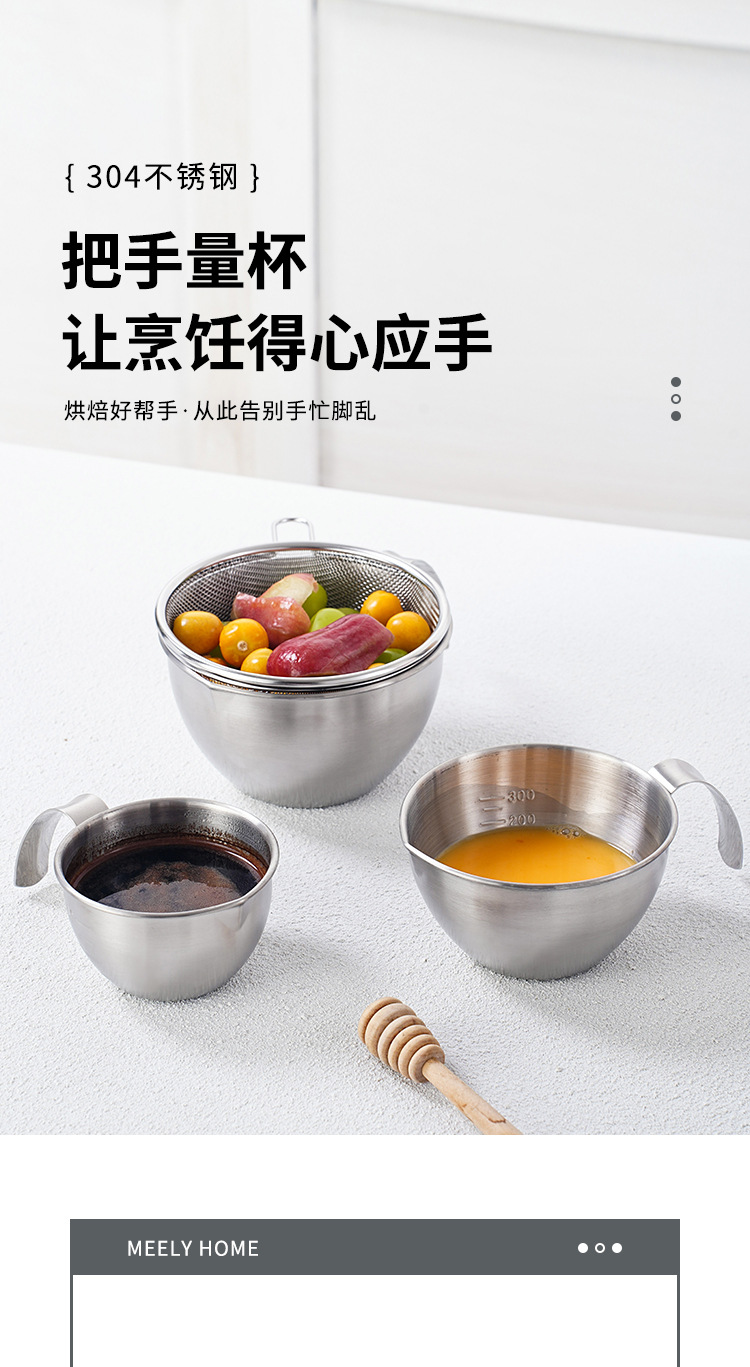 304ステンレス製調理ボウル、ハンドル付きミニ水切りかご、フルーツ・コーヒー計量カップ、目盛り付きベーキング・卵泡立てボウル