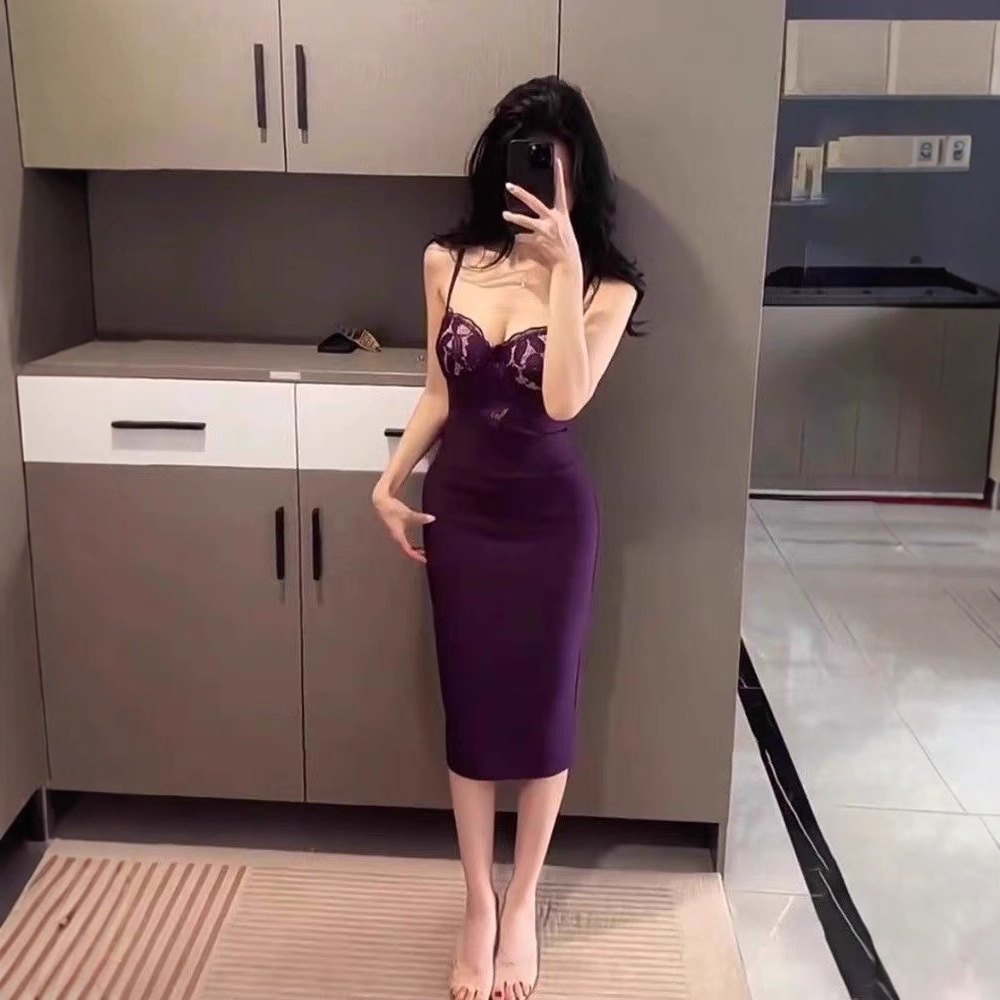 2025气质新款紫色夏季御姐蕾丝吊带拼接连衣裙辣妹纯欲风中长裙