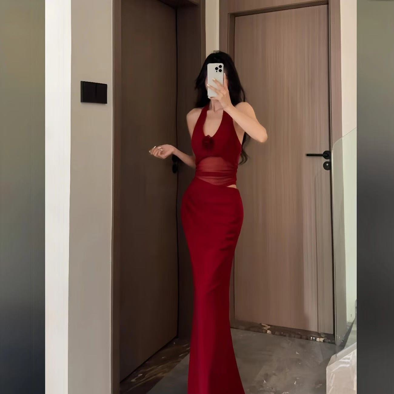 ホットガールチェーンホルターネックストラップデザインバックレスサスペンダードレス女性の春と夏のスリムフィットヒップフィッシュテールロングスカート