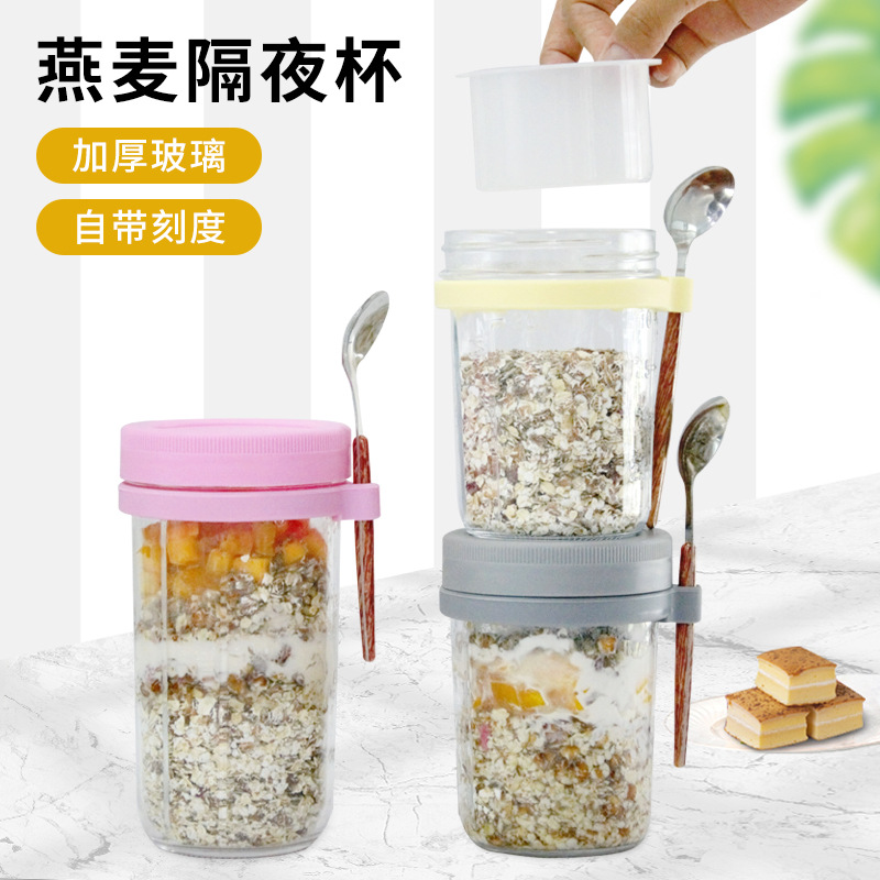 スプーンをかけるオート麦カップ朝食カップ高颜値ガラスカップ夜通しオート麦カップミルクカップサラダカップ