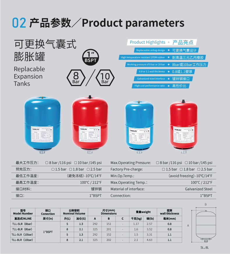 魯躍嚢式膨張タンク5L圧力タンク0.8mm厚耐熱安定タンク8Bar気圧タンク炭素鋼1インチ6分