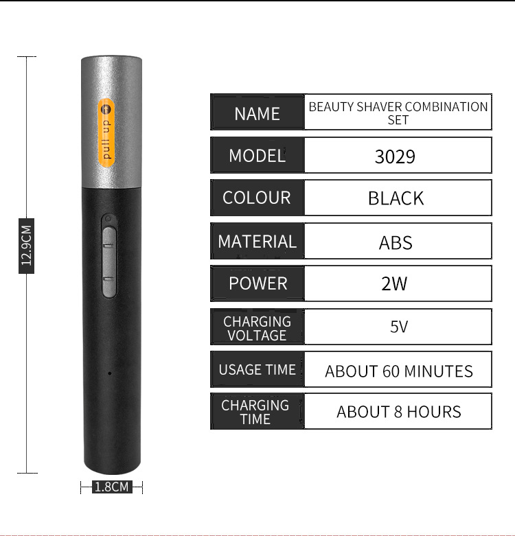 【可带附件】:修眉头,修眉刀头, 毛刷,USB数据线、英文说明书