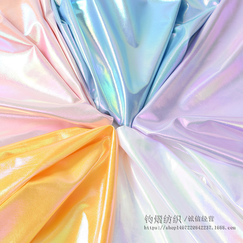カラフルなレーザー幻彩弾力性スパンデックス生地自慢舞台演出服箔押し生地背景装飾布卸売り