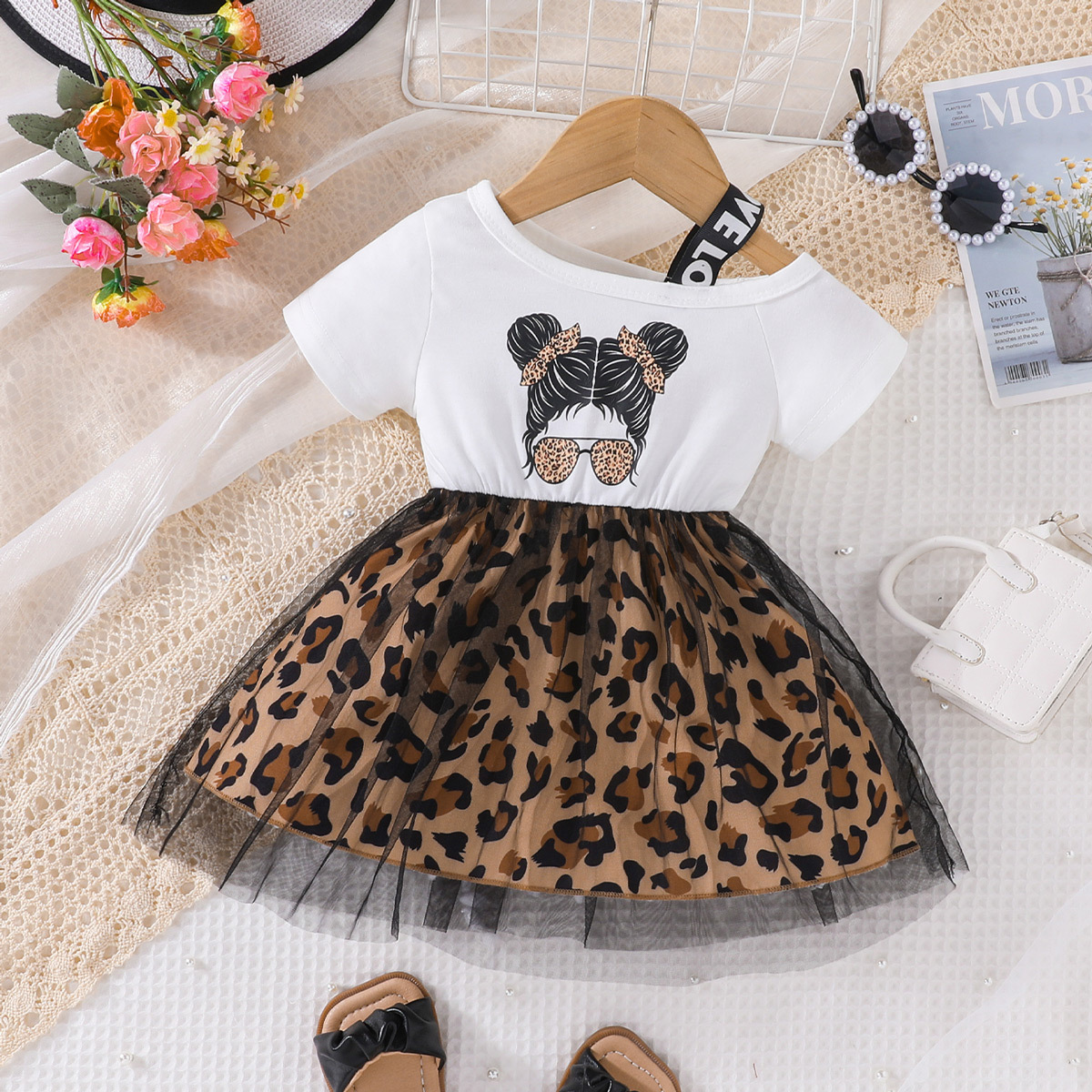 子供の売れ筋夏の女の赤ちゃんドレス 2025 新しいスタイル女の子プリントスプライシングヒョウ柄メッシュスカート