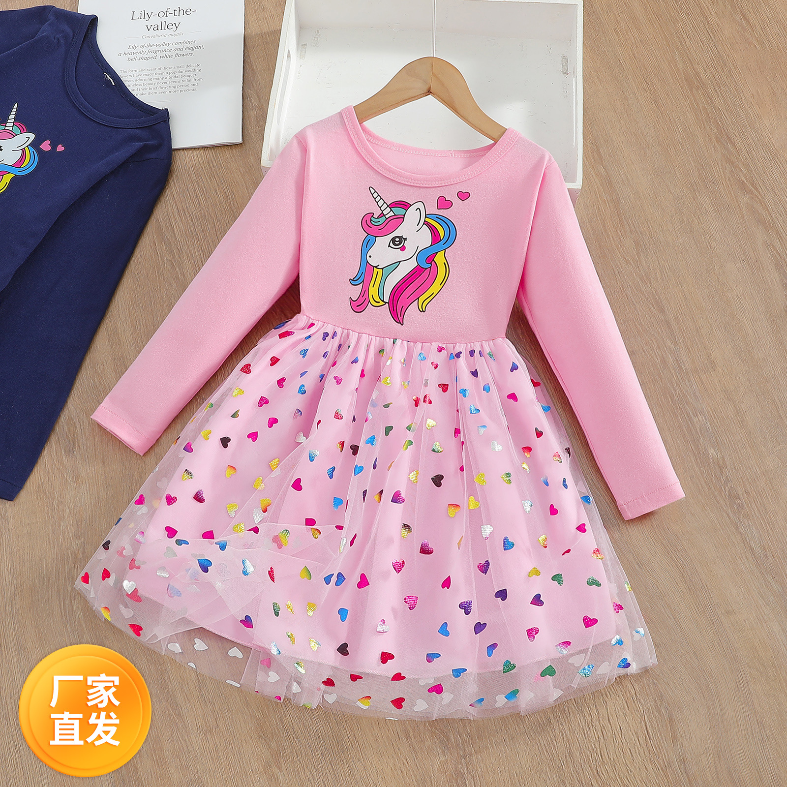 外国貿易の春の服の新型の女の子の小さい中の大きい子供の紗のスカートの綿の長袖の虹の馬の子供のピンクの女の子のワンピースの潮