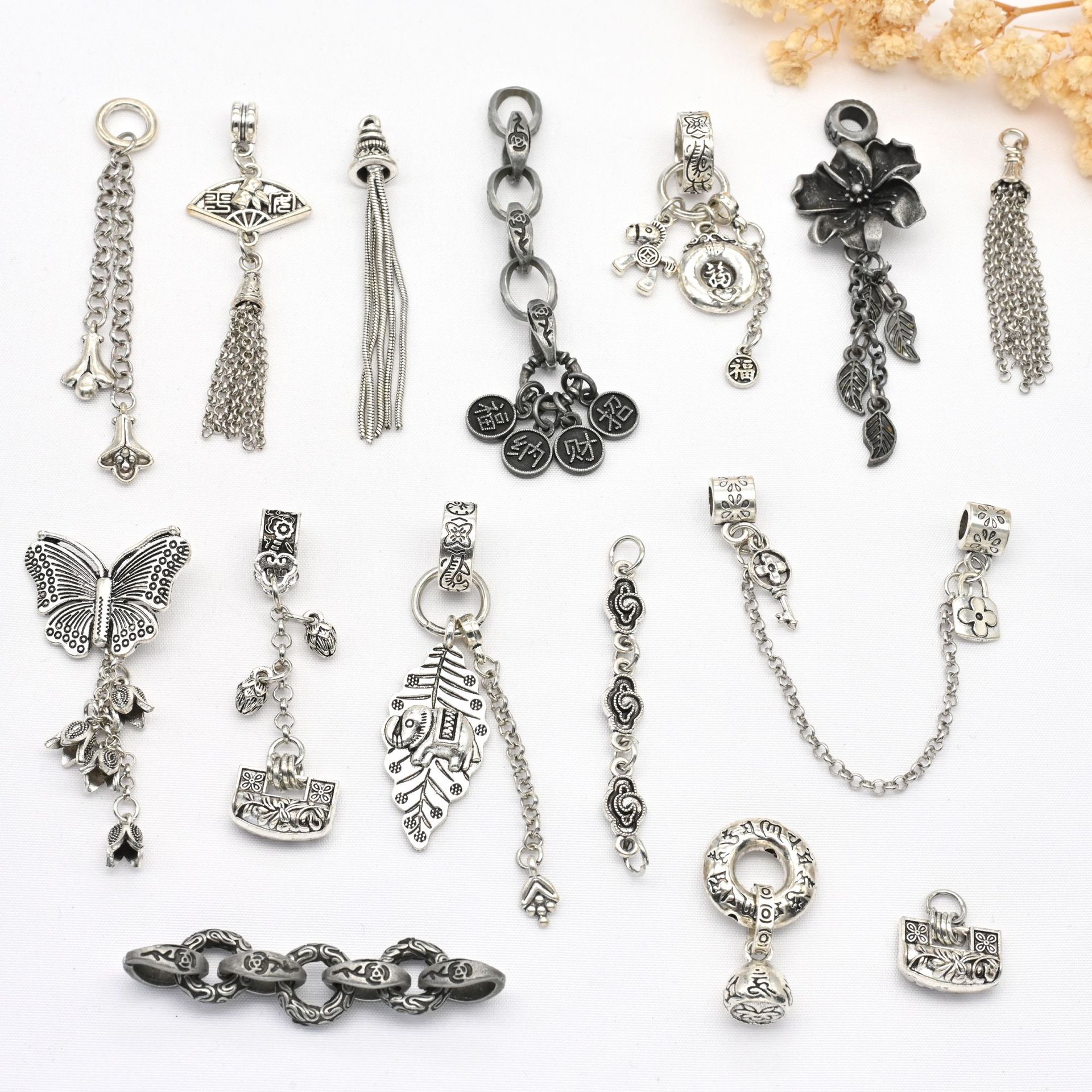 古银配件 diy水晶手串配饰蝴蝶扇子藏银色流苏吊坠民族风饰品挂饰