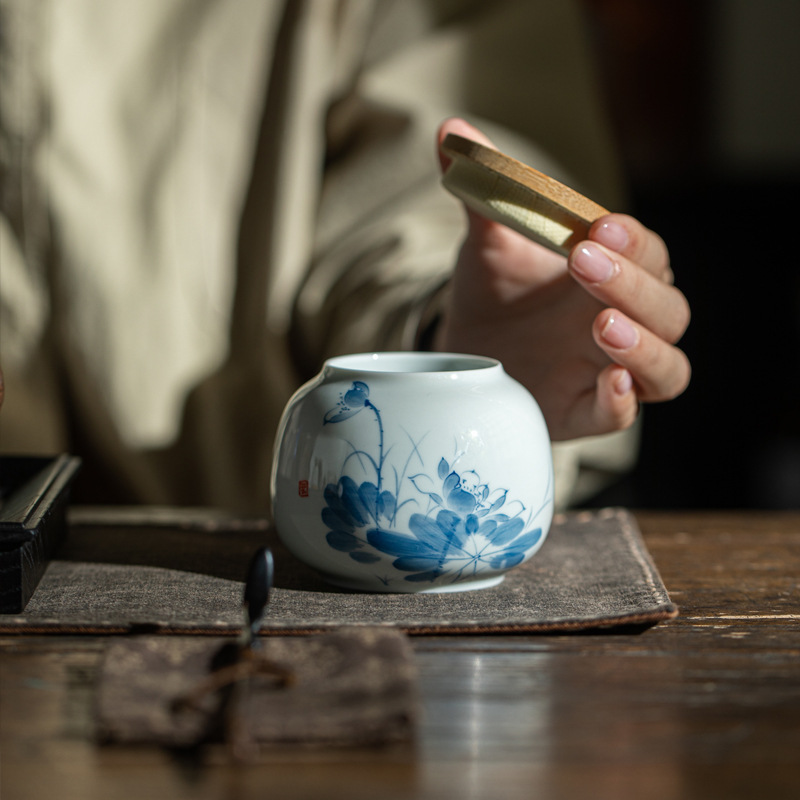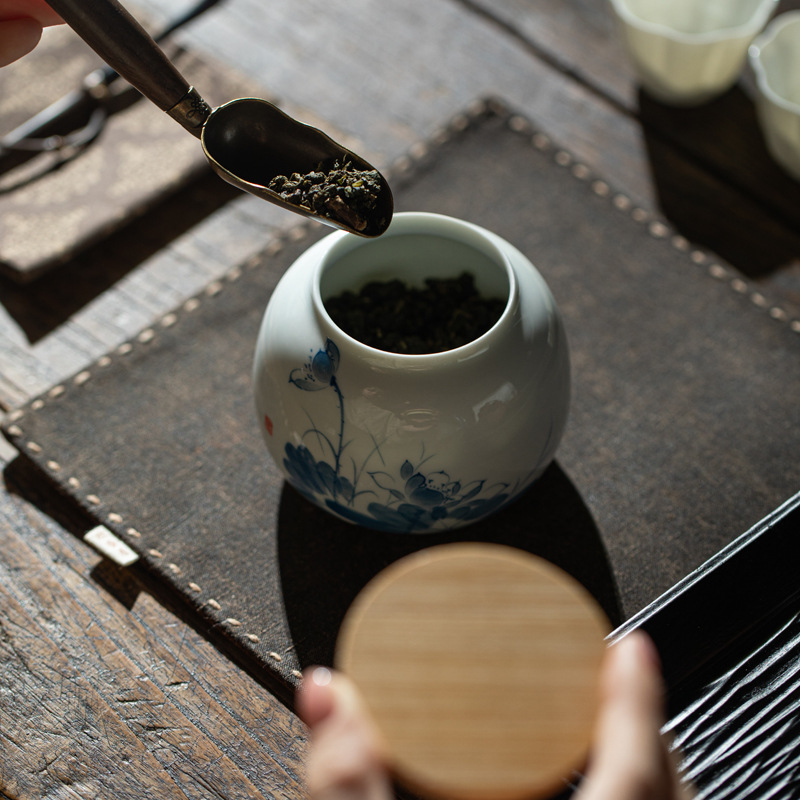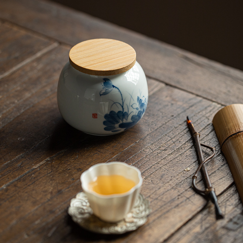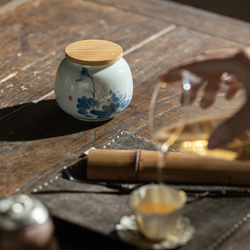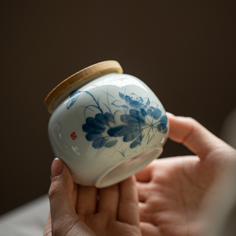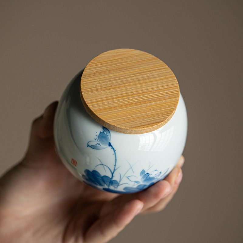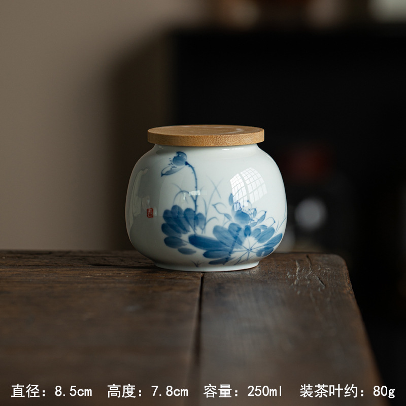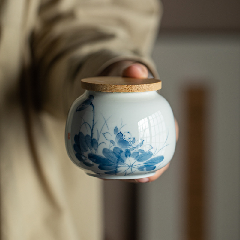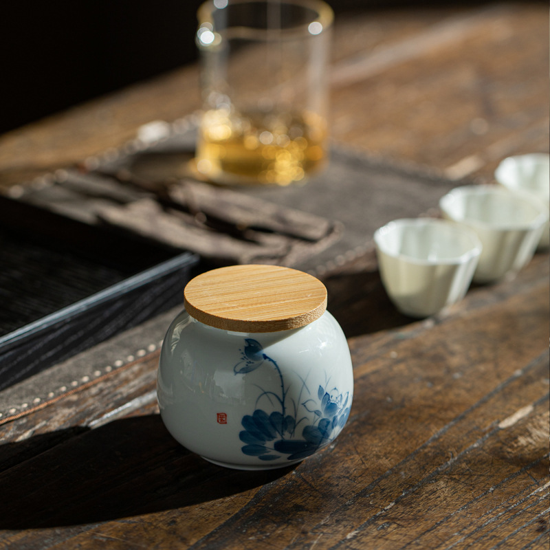 泥人は古青花手描き茶葉缶釉薬下彩田園花卉ハス花桃密封缶の小さな缶を述べた