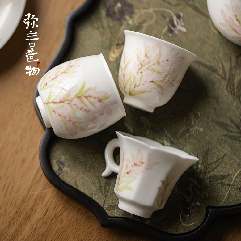 弥言白磁手描き紫藤花ティーカップ家庭用陶磁器お茶カップ薄手工夫茶道具品茗杯日本式