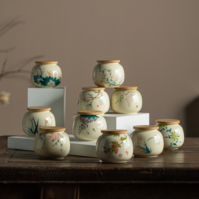 泥人叙蜜色釉薬手描き茶葉缶釉薬下彩ハス花桃花蘭紫藤チューリップ小密封缶