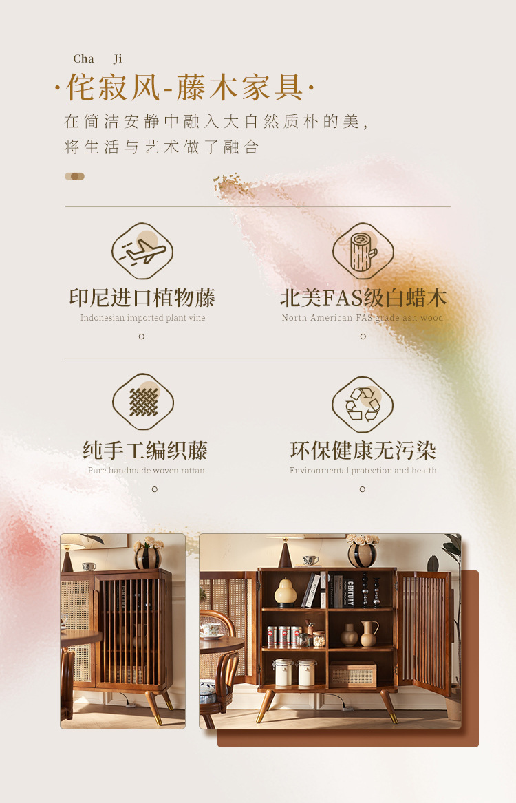 日本式藤編サイドキャビネット家庭用リビングルーム多機能収納キャビネット