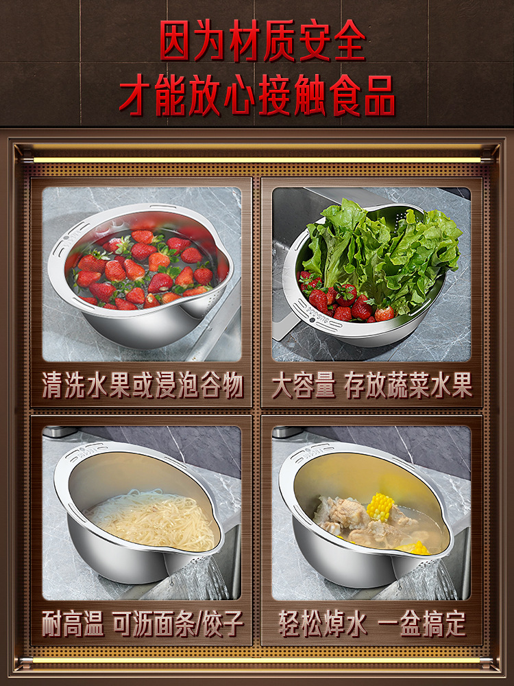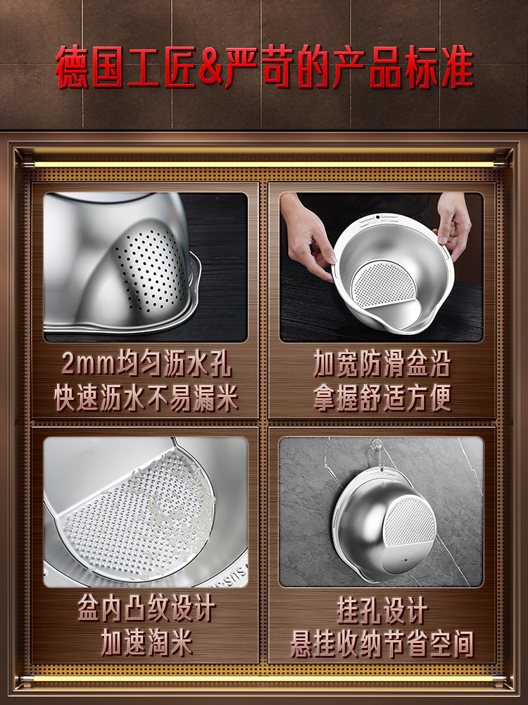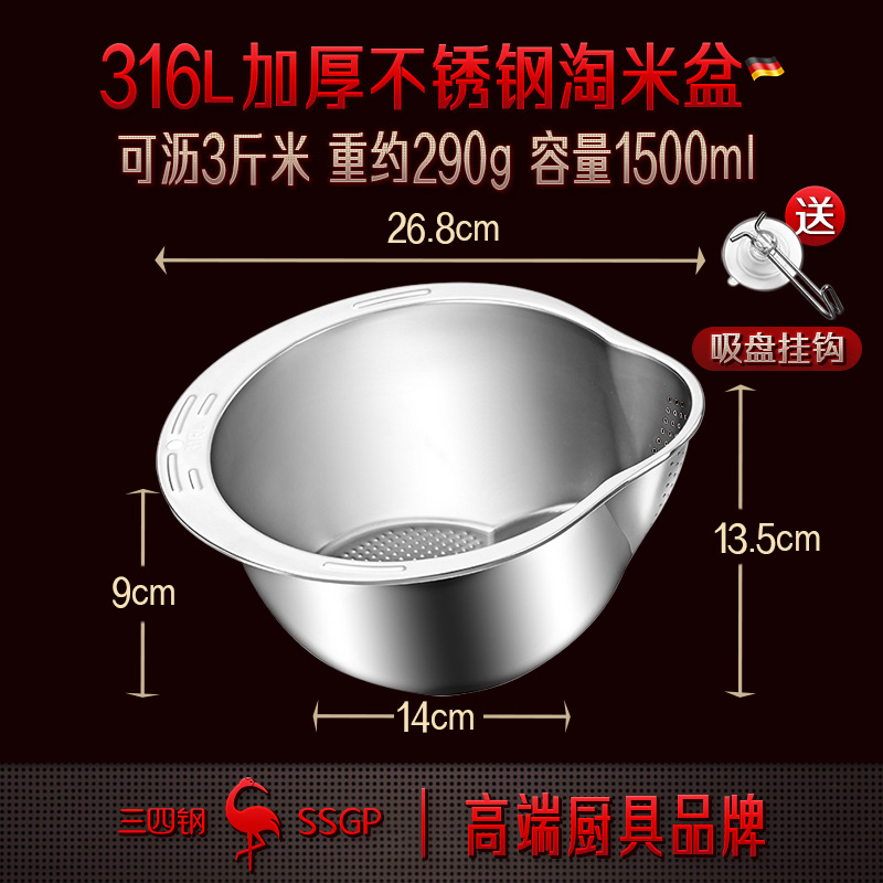 316食品级不锈钢淘米盆三件套洗米筛家用洗菜盆果蔬沥水篮研磨器