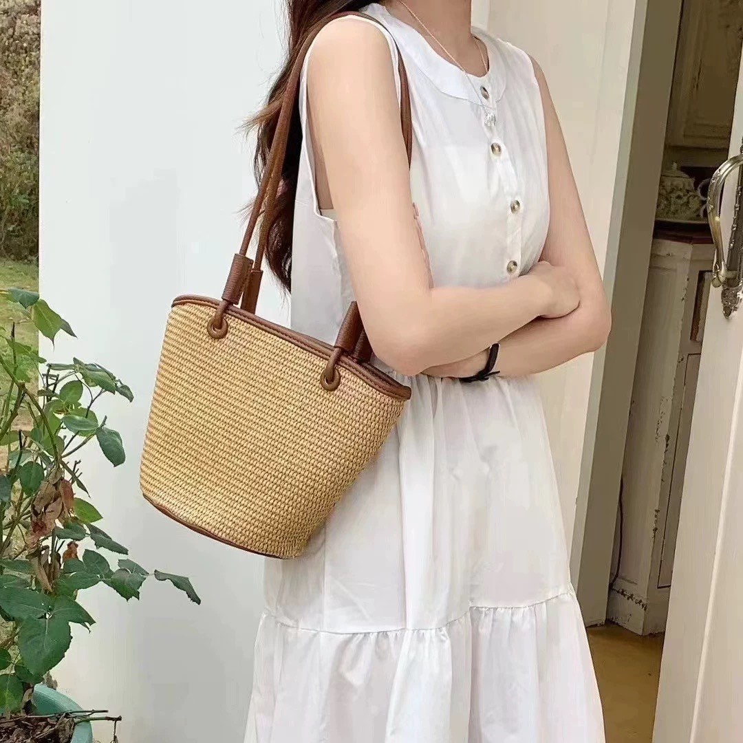 牧歌的なスタイルの女性のための織バッグ 2025 新しい海辺の休暇ビーチわらバッグ夏のカジュアルショルダーバケットバッグ