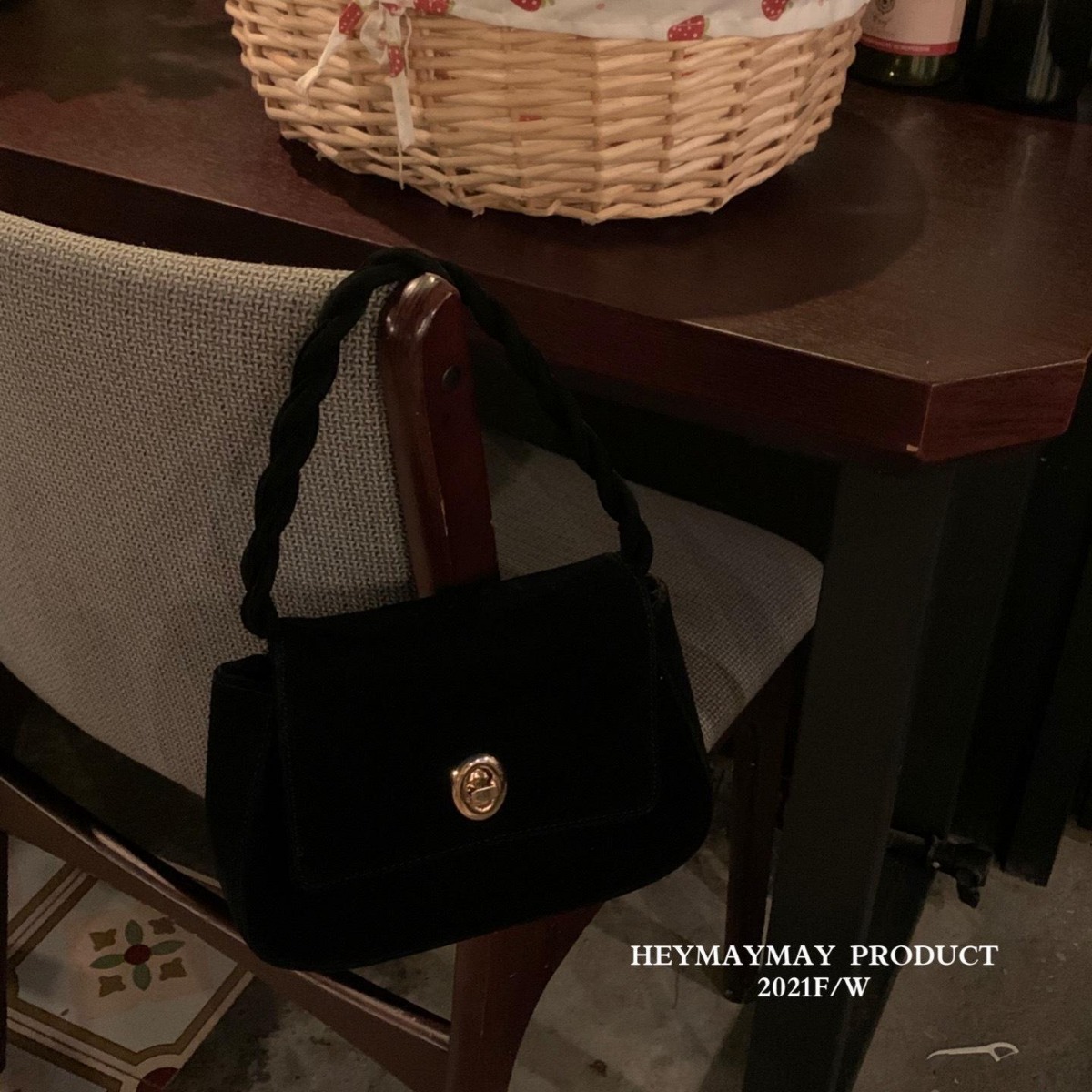 韓国秋冬2023新型ファッション百合黒色絨毛霧面フランス金ボタン復古手作り麻花ハンドバッグ