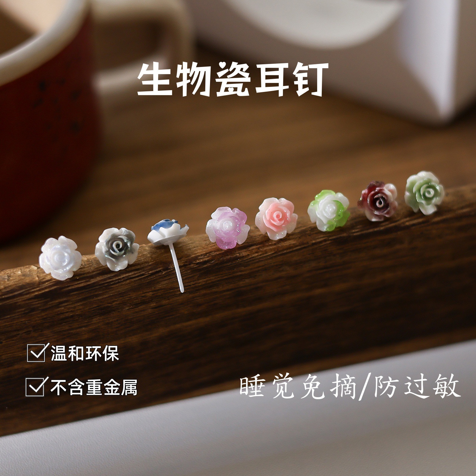 生物瓷玫瑰花耳钉套装可爱防敏养耳洞睡觉免摘耳环简约陶瓷针耳