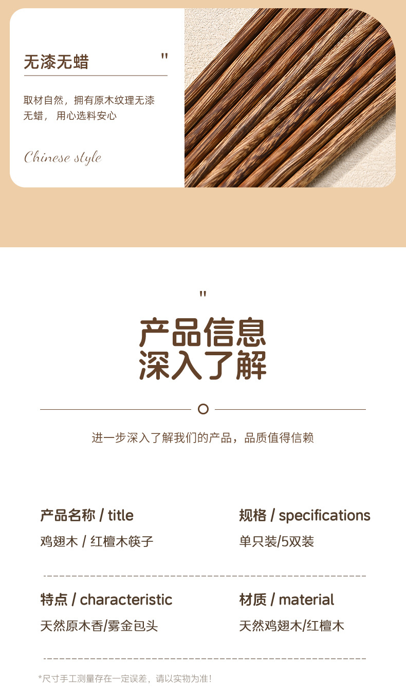 紅檀木箸実木無漆無ワックス家庭用木質滑り止め天然原木箸無漆無ワックスキッチン食器