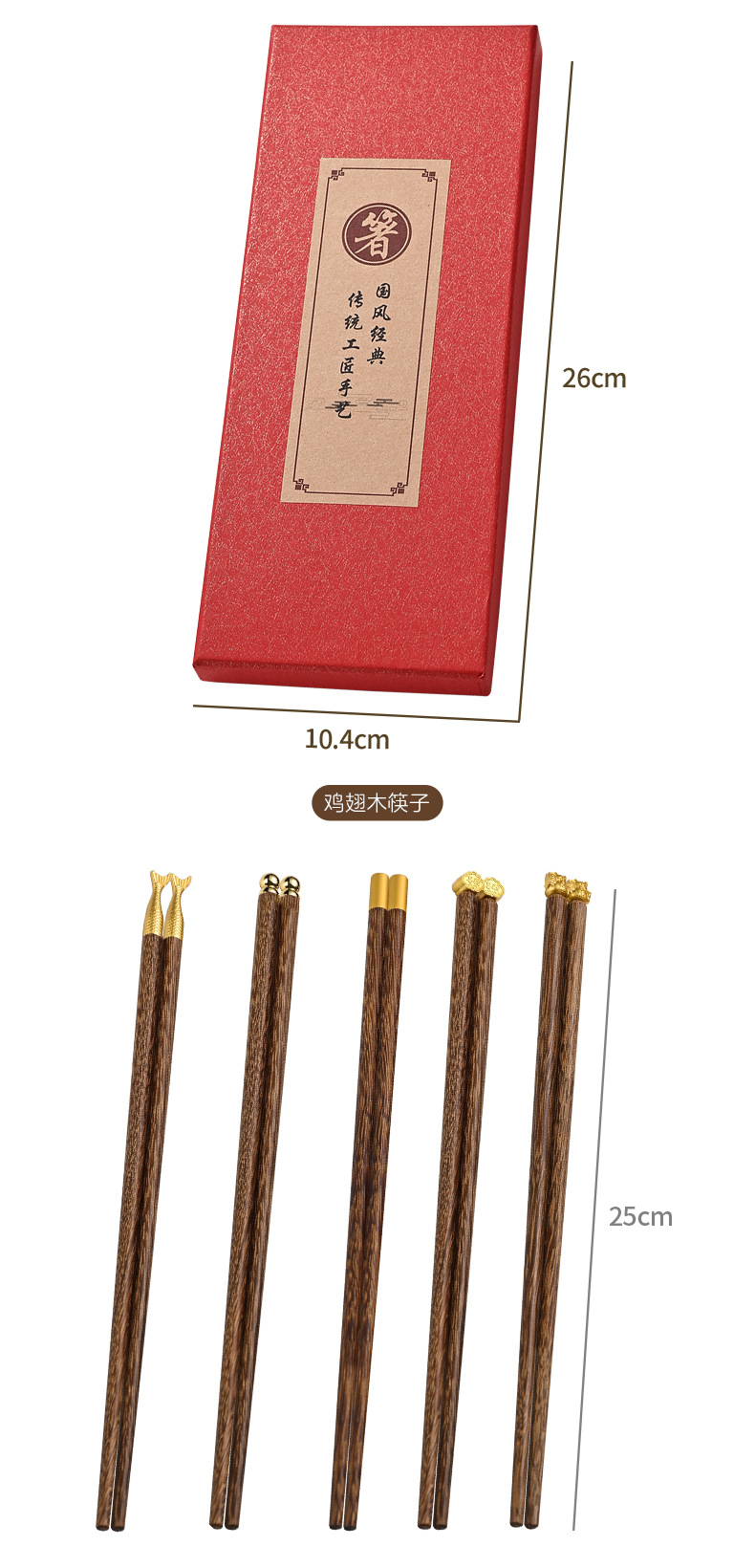 円形の福鶏翼木箸、紫檀箸、無塗装無ワックス無垢材箸、ギフト箸、中国風箸、家庭用福箸