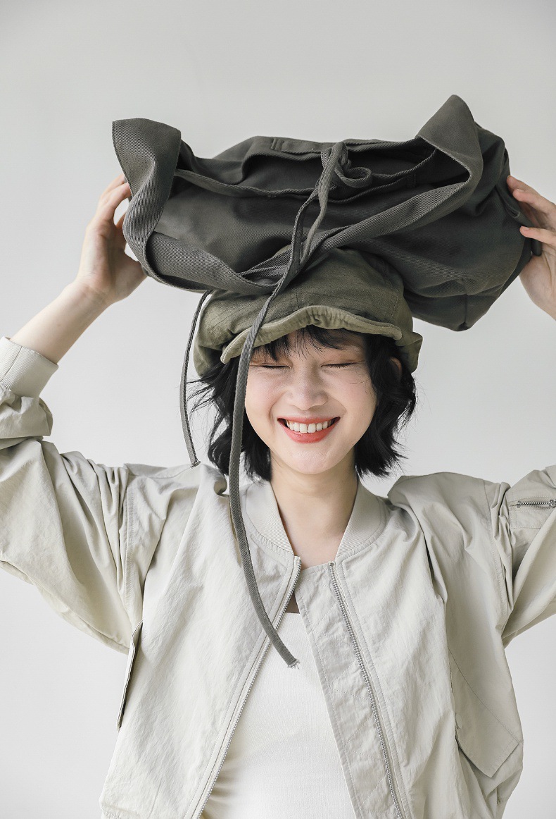 前進帽子の女性デザイナーは自分で金の大きい版を残して顔を見せます。