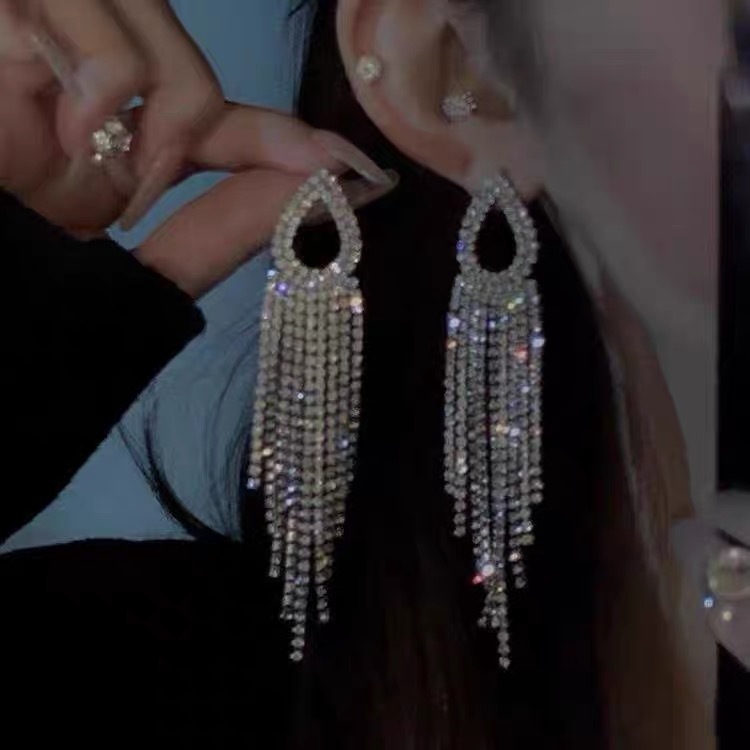 S925銀針水滴にドリルを入れたロングタイプのフリンジイヤリング韓国ファッションデザイン感があります。
