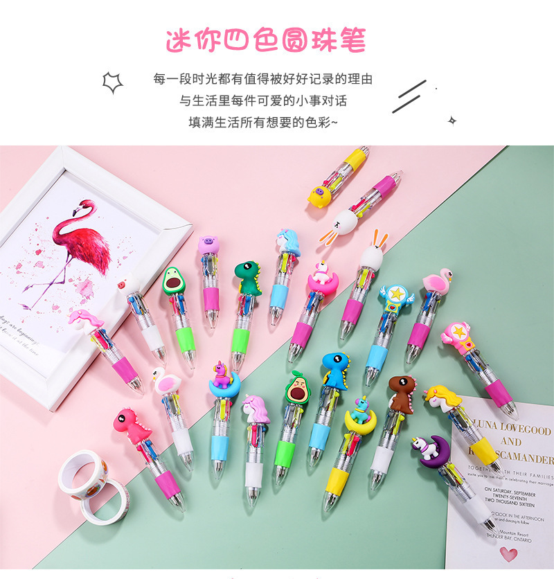 国境を越えた販売専用ミニ四色ボールペン、ins風のかわいいキャラクターカラフルプッシュ式ペン、学生向け賞品卸売、キュートで楽しい。