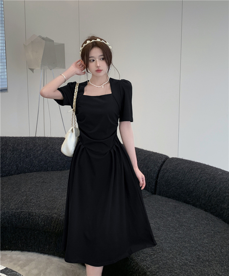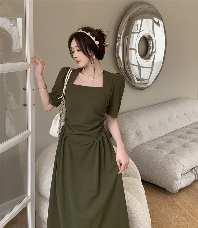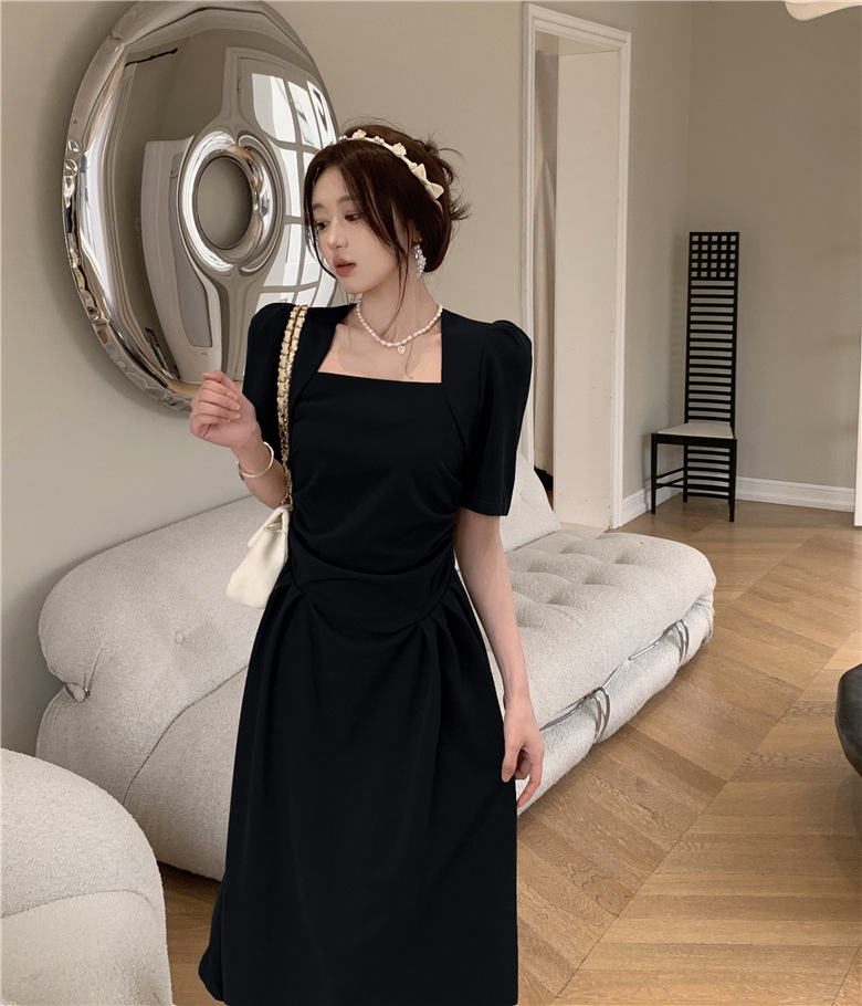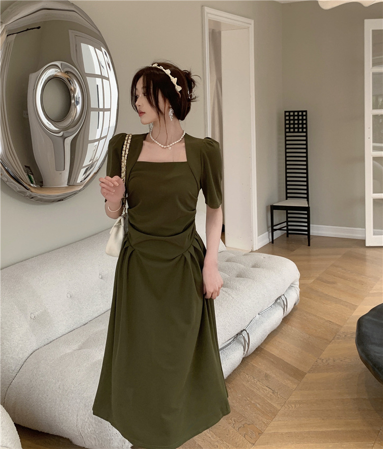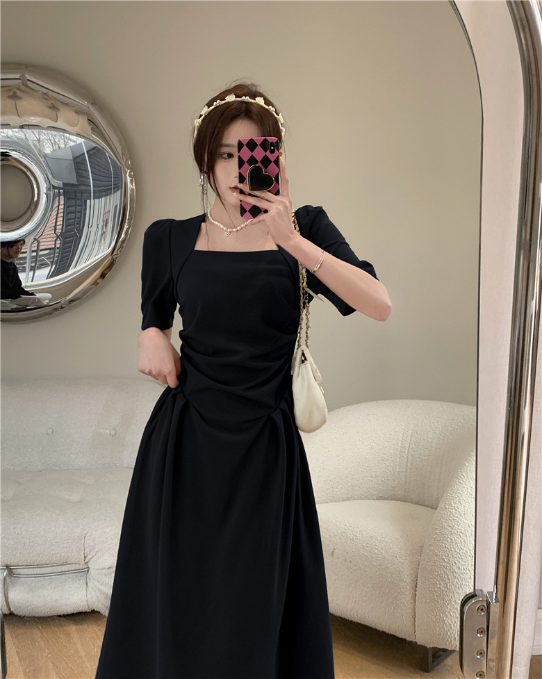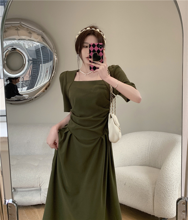 フランスの気質は腰のしわを収めて肩の半袖のワンピースの2024夏の新型のデザインの小さい大衆の方襟の長いスカートを収めます。