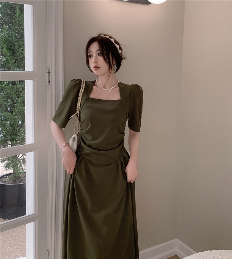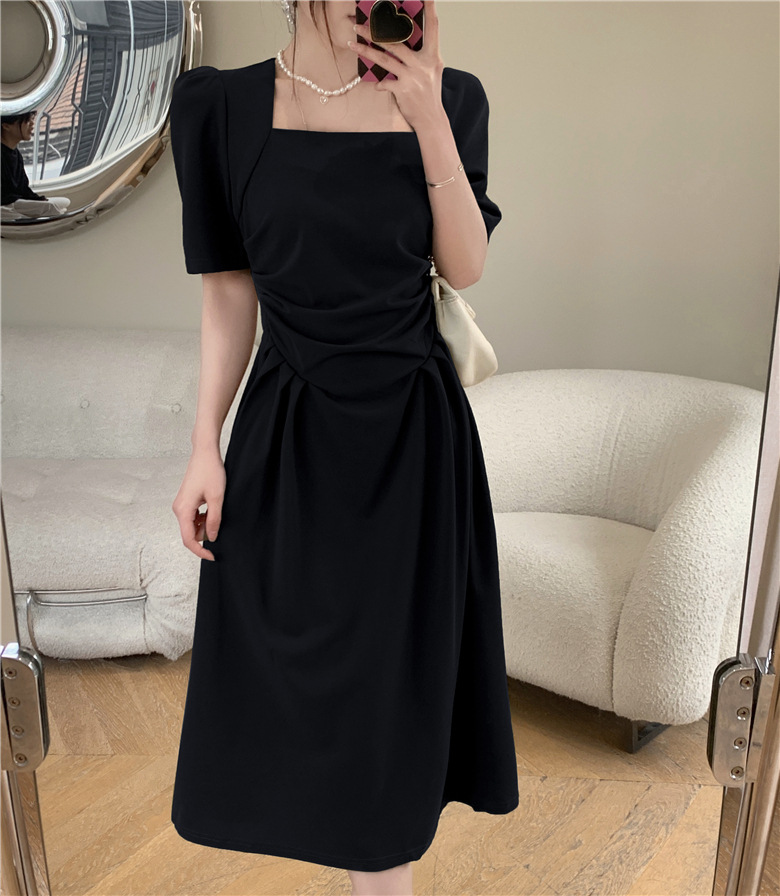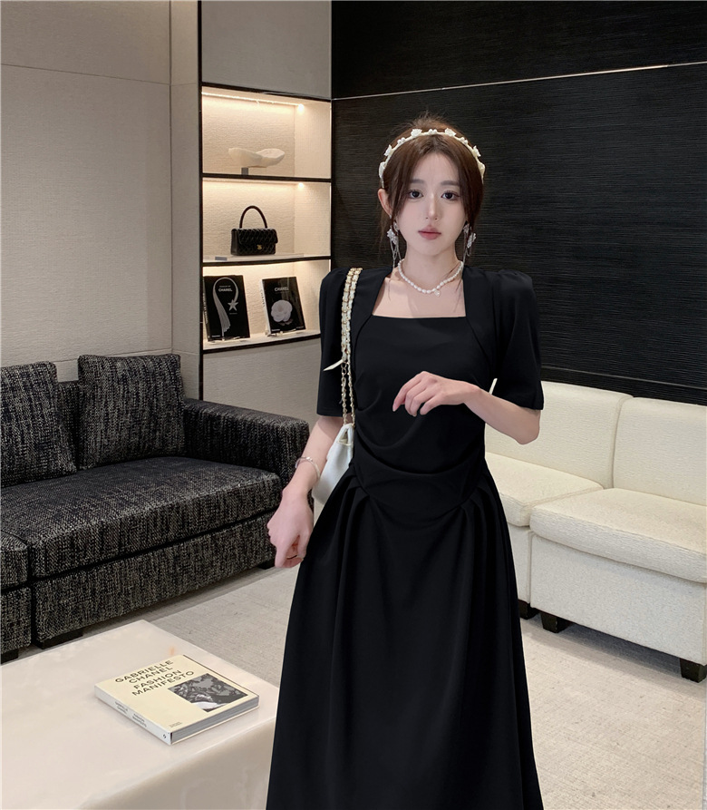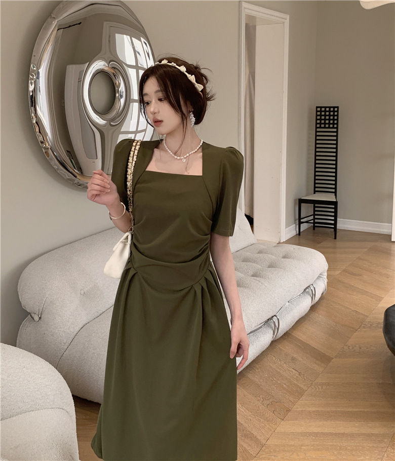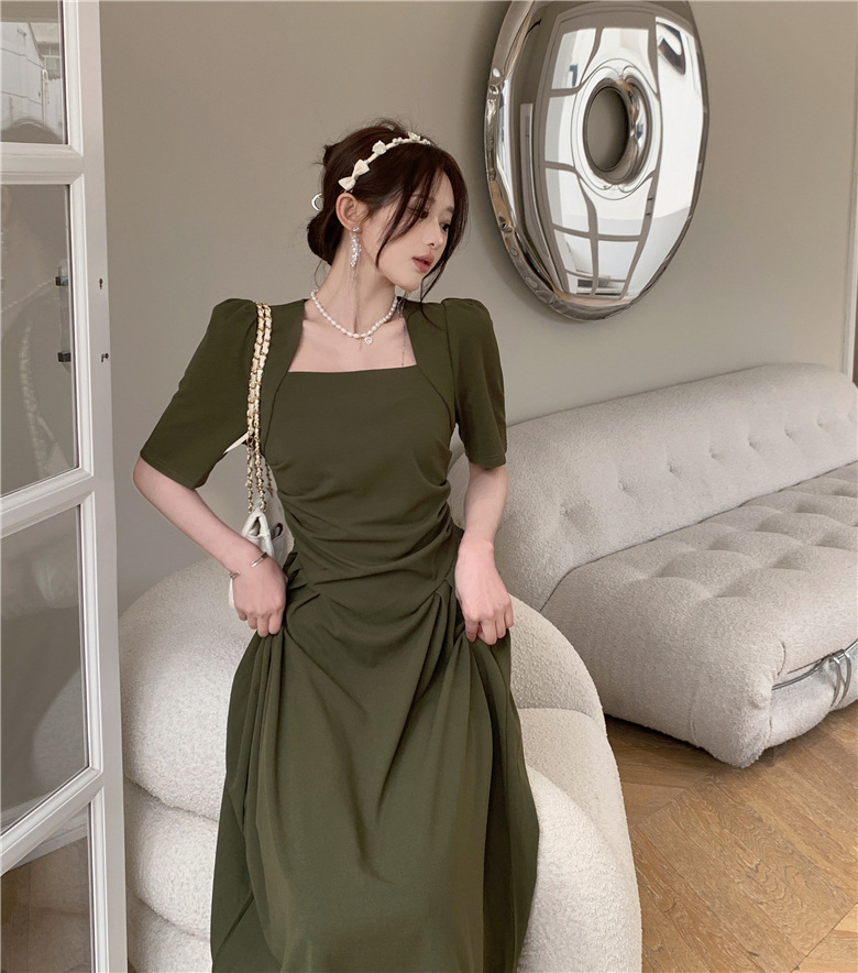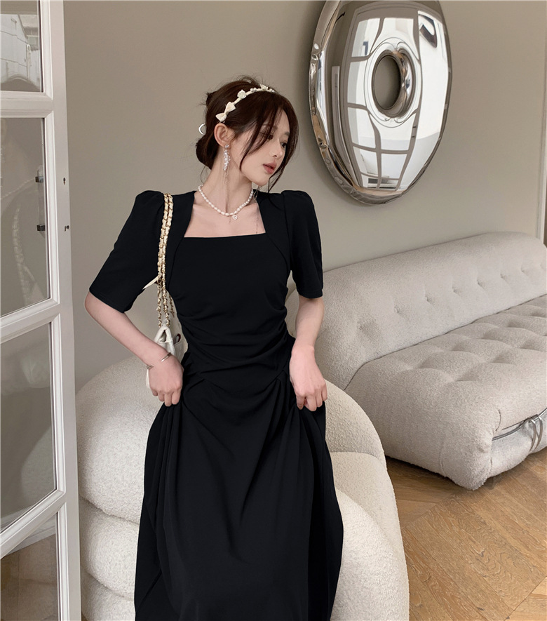 フランスの気質は腰のしわを収めて肩の半袖のワンピースの2024夏の新型のデザインの小さい大衆の方襟の長いスカートを収めます。