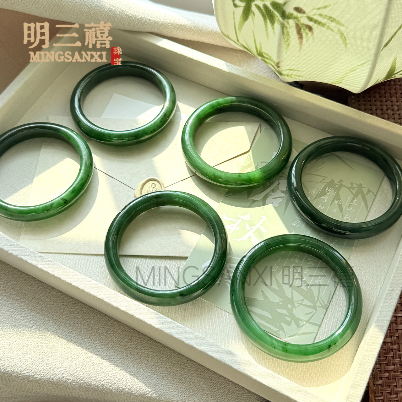 批发然高冰种碧玉手镯菠菜绿女款正圈扁条俄罗斯和田玉晴水玉镯子