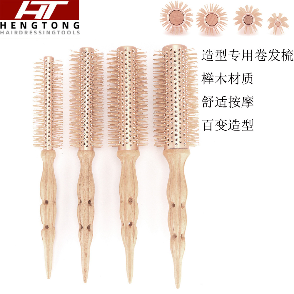 卸売カーリーヘアスタイリングストレートヘアふわふわコームカーリングコームインナーバックル高温耐性コームローリングコーム理髪木製ラウンドローリングコーム