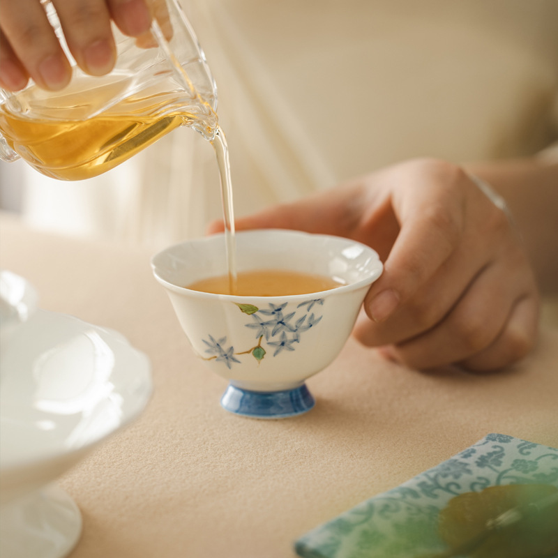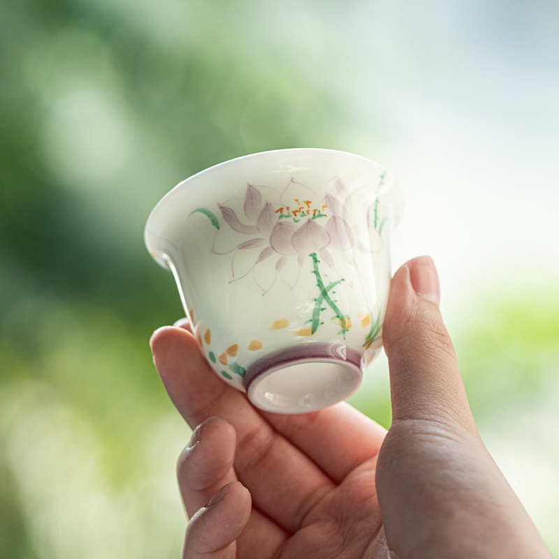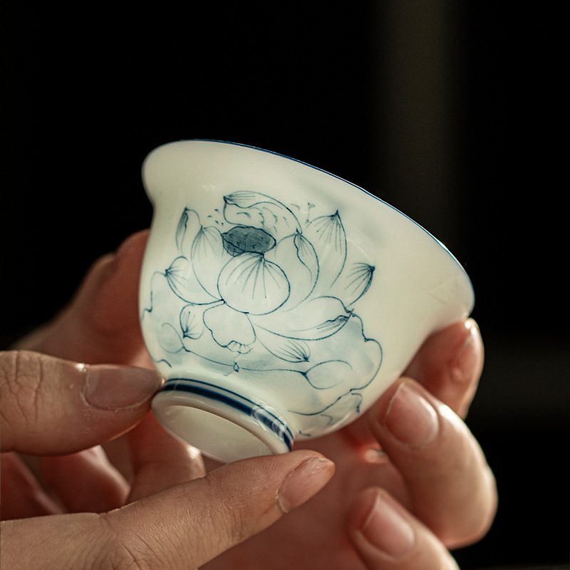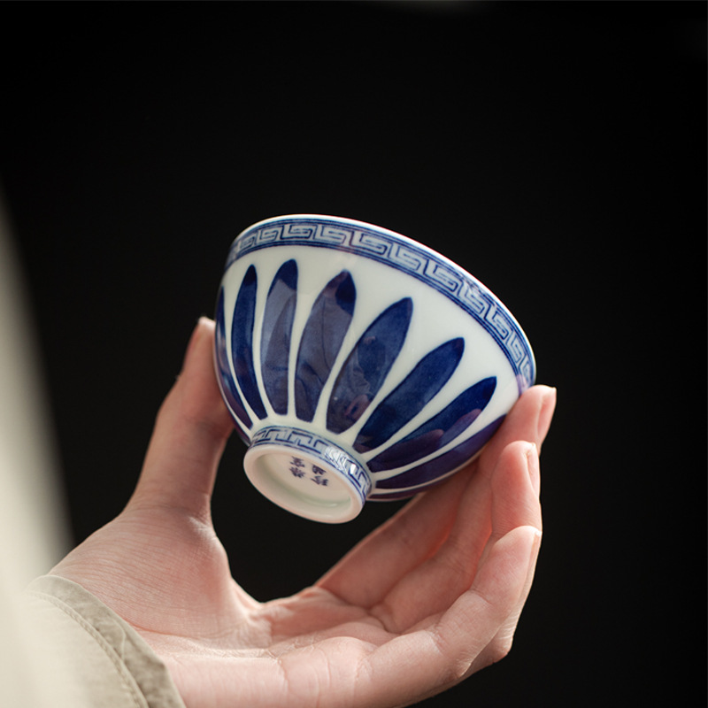 青花宝相菊鶏心杯カンフー茶器釉薬中彩主人杯禅意仏道家庭用カップ単杯