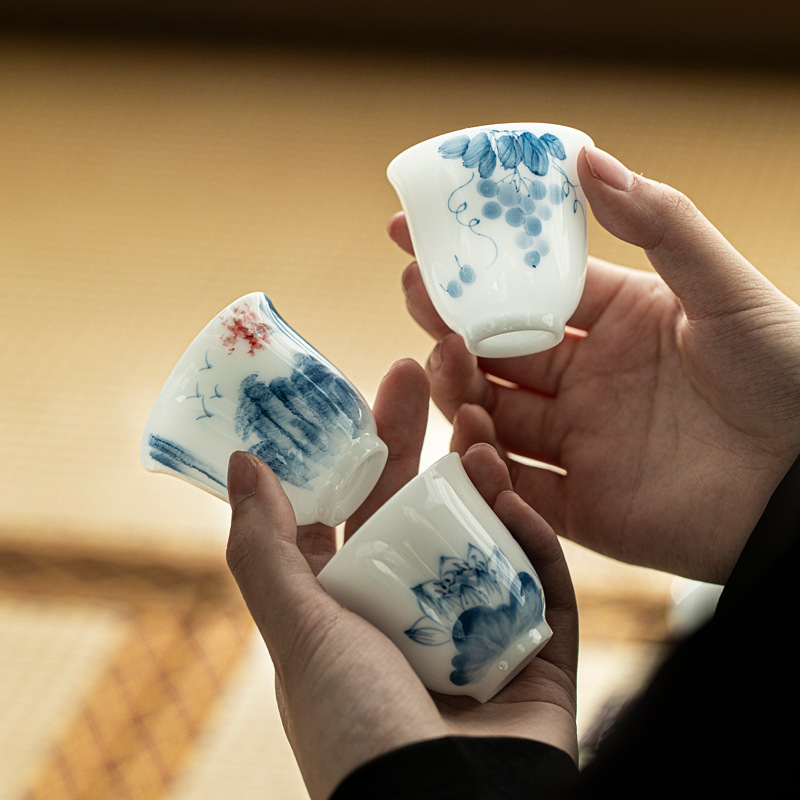 新中国式青花手描き氷種玉磁器品茗杯カンフー茶器陶磁器カップ釉薬下彩レトロ小コップ