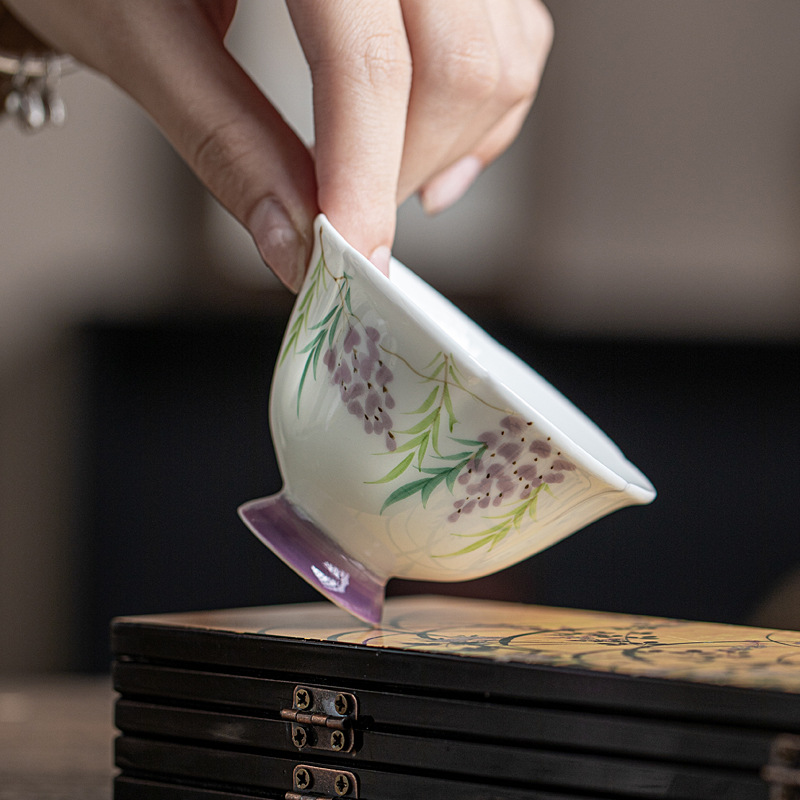 泥人叙玉白手描き紫藤主人杯釉薬下彩花弁高足茶杯手作り女性品茗杯