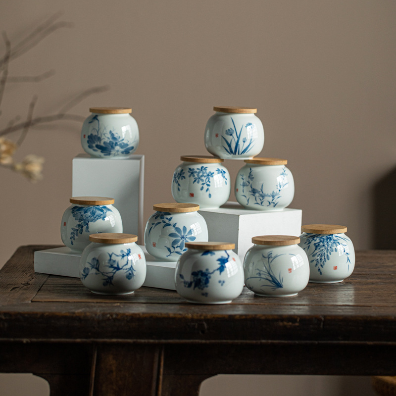 泥人は古青花手描き茶葉缶釉薬下彩田園花卉ハス花桃密封缶の小さな缶を述べた