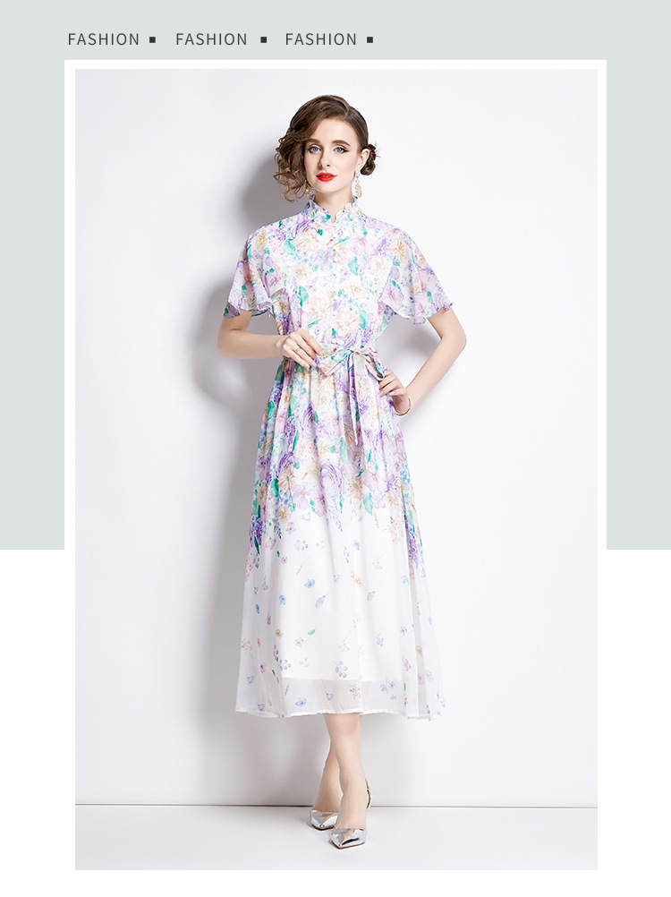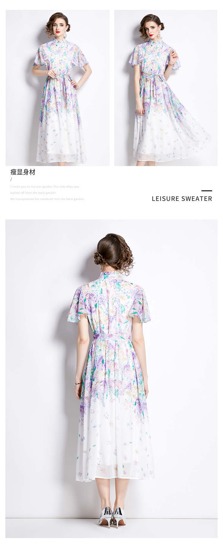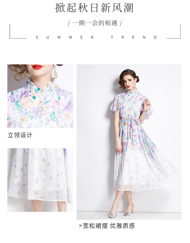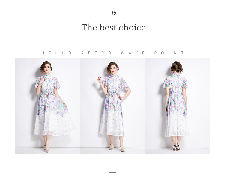 クロスボーダーの外国貿易の婦人服の2024夏の新型の小さい飛の袖のハスの葉の辺の砕花の色は腰の木の耳の襟のワンピースを収めます。