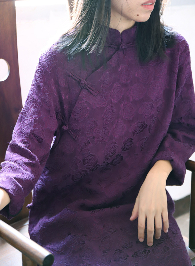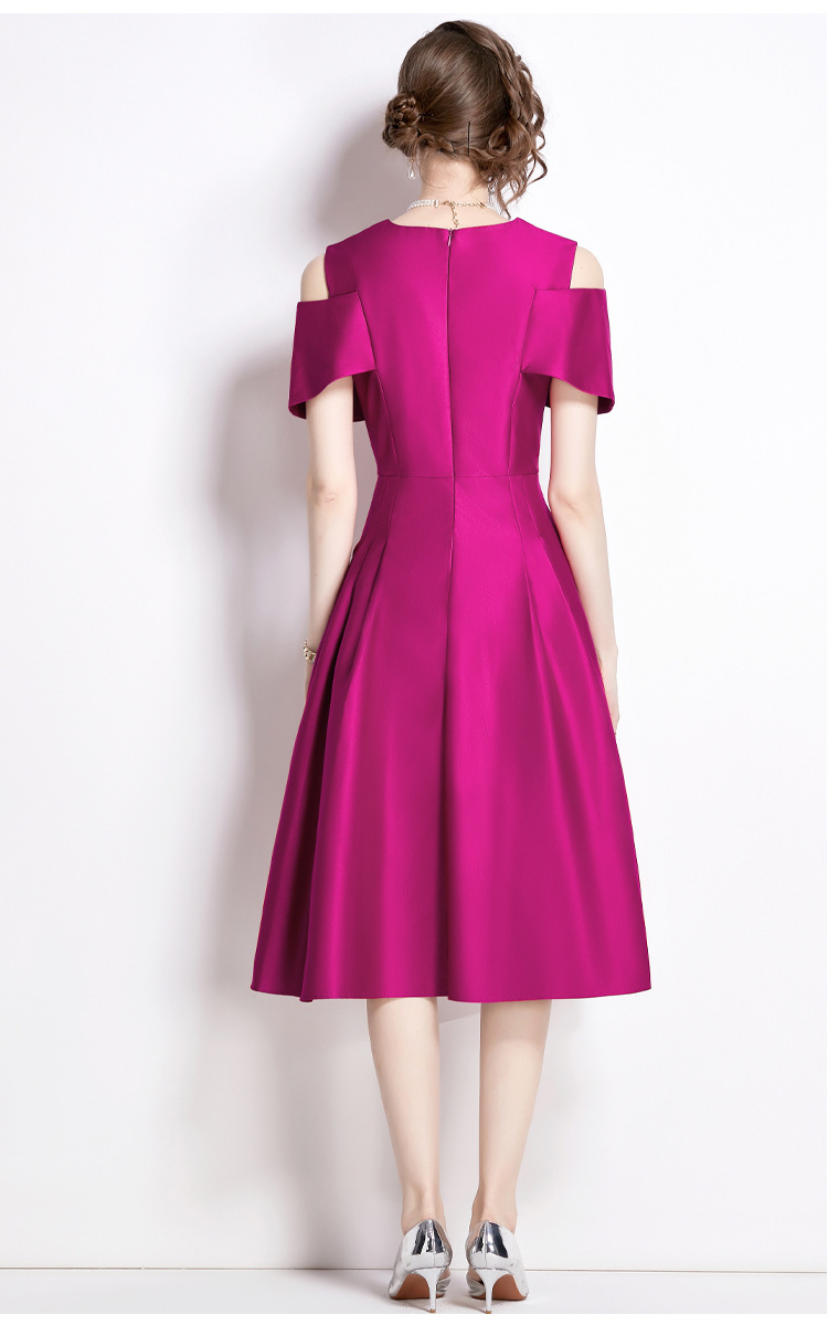 夏の新しい半袖レースドレスの女性のミッドレングスフックパターン中空紫ハイウエスト Aa ラインスカート痩身