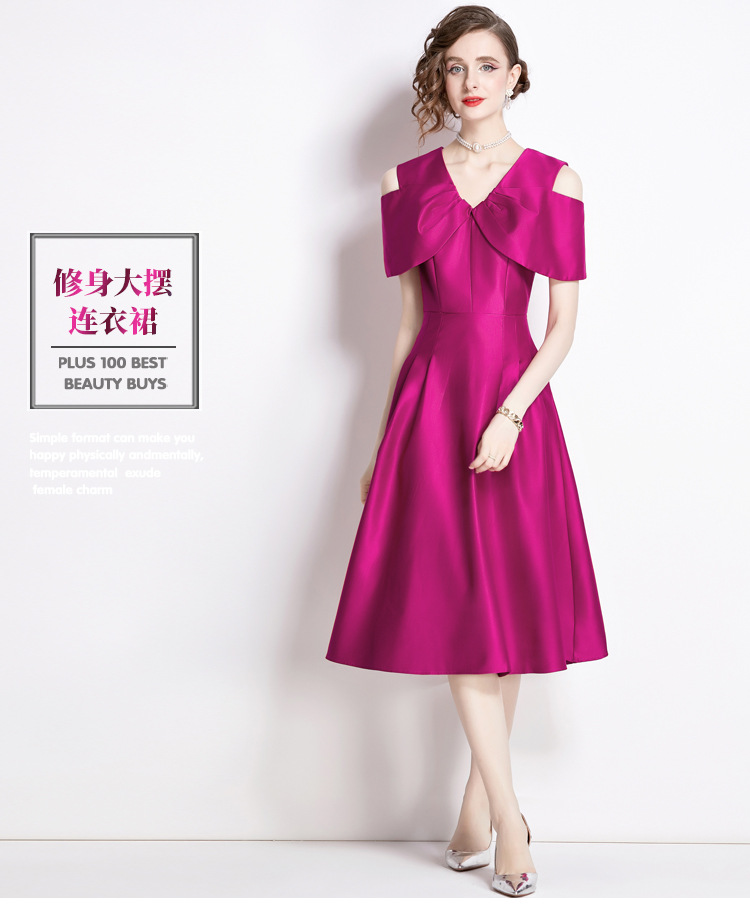 玫红色新款小众设计立体大蝴蝶结高腰大摆礼服连衣裙