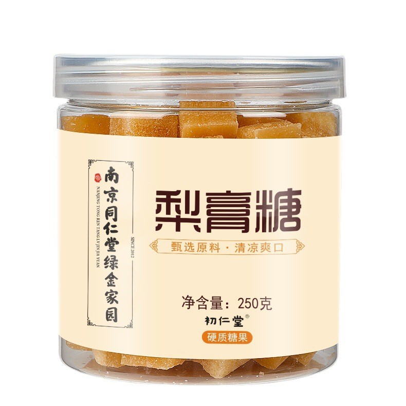 百草梨膏糖メーカーは南京同仁堂梨膏糖缶に秋梨膏糖を入れて江湖潤喉糖を走る