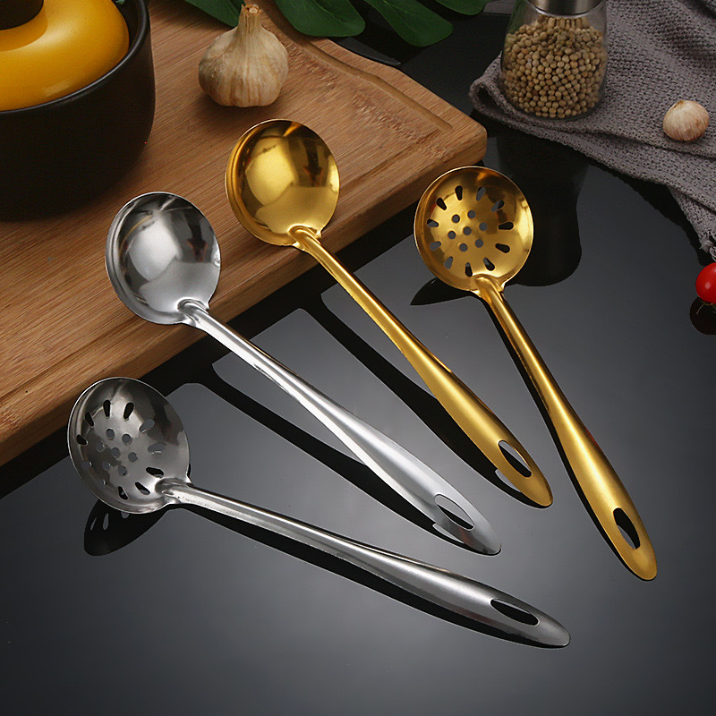 ステンレススプーン家庭用キッチン共通スプーン吊り下げ可能ハンドル長柄火鍋スプーン漏れスプーン調理スープケース卸売り