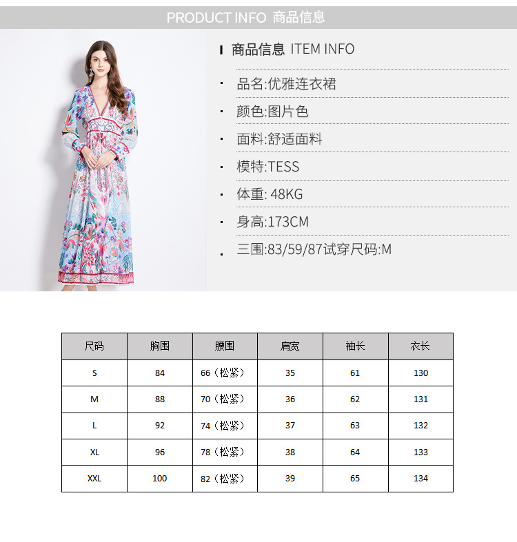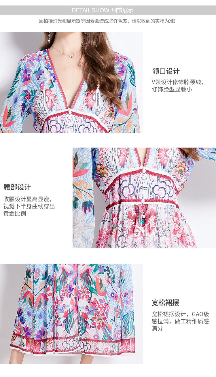 外国貿易輸出女装2024新型リゾート風デザイン感vネックプリント長袖ウエストワンピース
