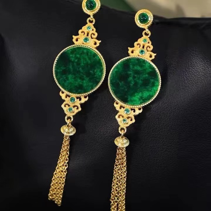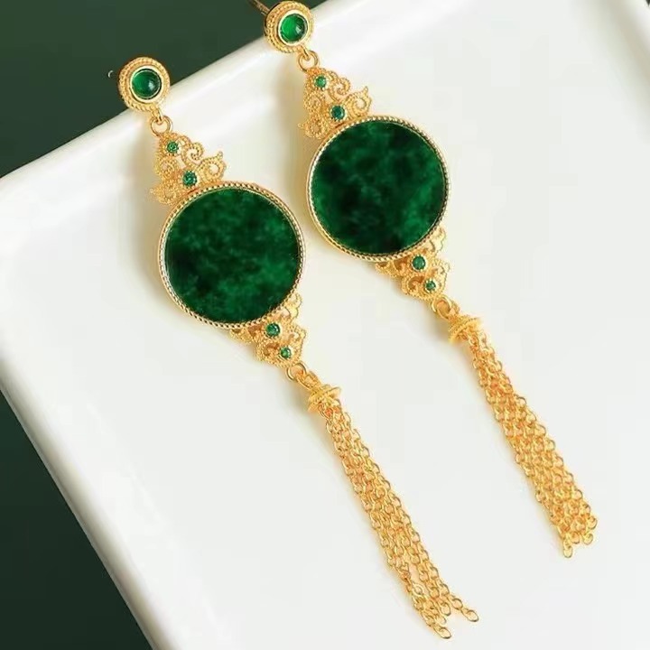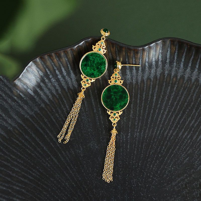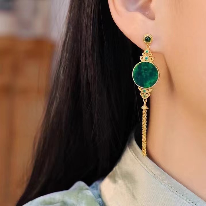天然石ドライグリーンイヤリング、s925シルバーメッキ、誕生日プレゼント、高級ファッションレトロロングタッセルイヤリング