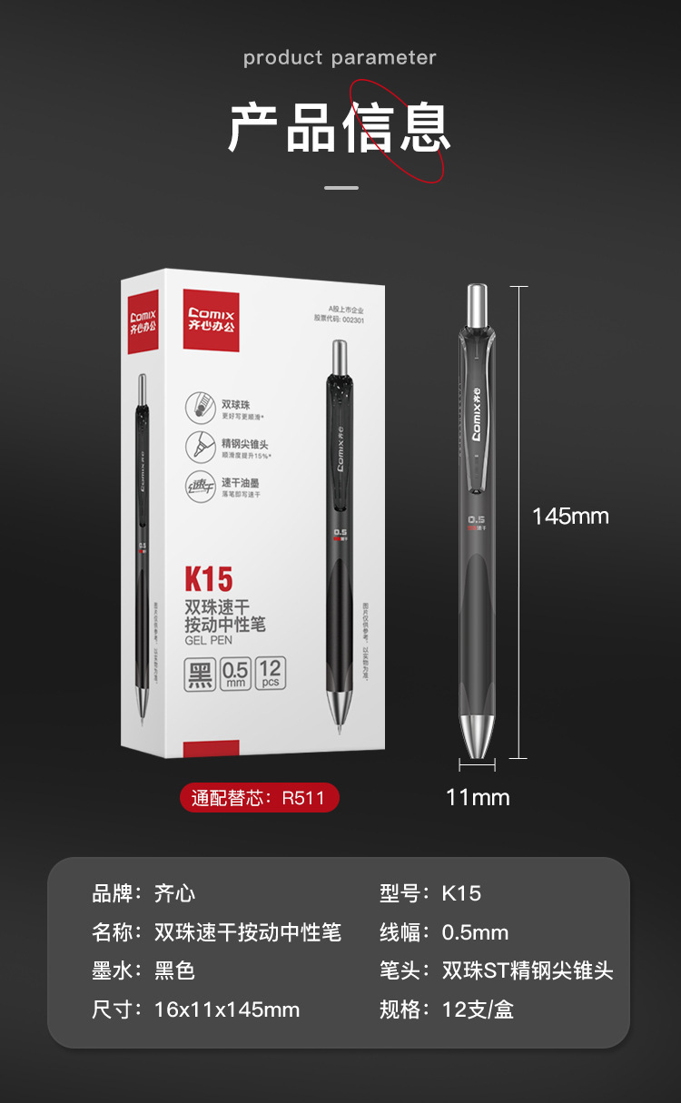 有力S08押し中性ペン0.5mm黒芯サインペン赤押し水筆学生試験炭素ペン