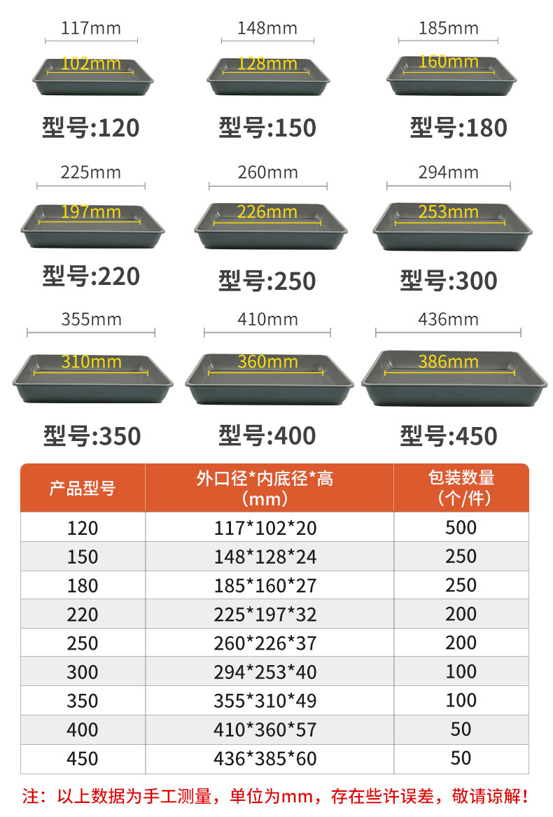 120(外径117×高さ20mm) 500個/個,150(外径148×高さ24mm) 250個/個,180(外径185×高さ27mm) 250個/個,220(外径225×高さ32mm) 200個/個,250(外径260×高さ37mm) 200個/個,300(外径294×高さ40mm) 100個/個,350(外径355×高さ49mm) 100個/個,400(外径410×高さ57mm) 50個/個,450(外径436×高さ60mm) 50個/個,180(底内径:縦155×横111mm) 1個あたり600個,200(内底径:縦170×横126mm) 1枚あたり400枚,270(底内径:縦210×横130mm) 1枚あたり400枚,280(底内径:縦235×横150mm) 1枚あたり200枚,320(内底径:縦270×横181mm) 1個あたり200個,350(底内径:縦290×横198mm) 1個あたり250枚,440(底内径:縦343×横223mm) 1個あたり200個,500(底内径:縦388×横256mm) 1個あたり80個,560(底内径:縦448×横305mm) 1個あたり80個,630(底内径:縦519×横356mm) 1個あたり50個,700(底内径:縦547×横385mm) 1個あたり50個,740(内底径:縦618×横391mm) 1枚あたり40枚,800(内底径:縦685×横414mm) 1個あたり25個,950(内底径:縦840×横494mm) 1個あたり20個