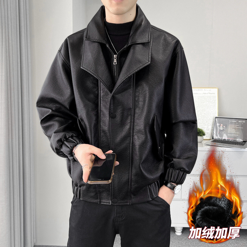 假两件PU皮衣夹克外套男秋冬美式复古痞帅宽松美拉德加绒皮夹克男