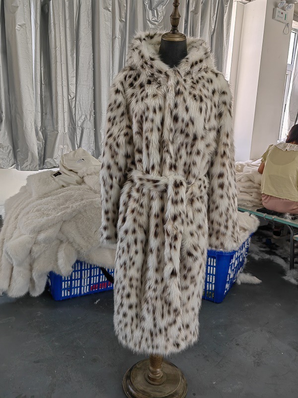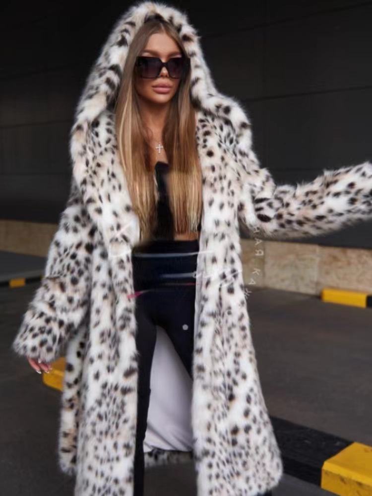 跨境亚马逊女装豹纹连帽仿皮草外套托卡长款大衣加厚保暖貂绒风衣