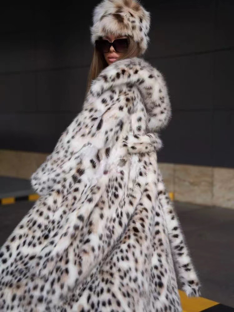 山猫柄フェイクフォックスファー女性用コート、厚手で環境に優しい、ロング丈、ヒョウ柄、スーツカラー、高級感のあるファー大衣