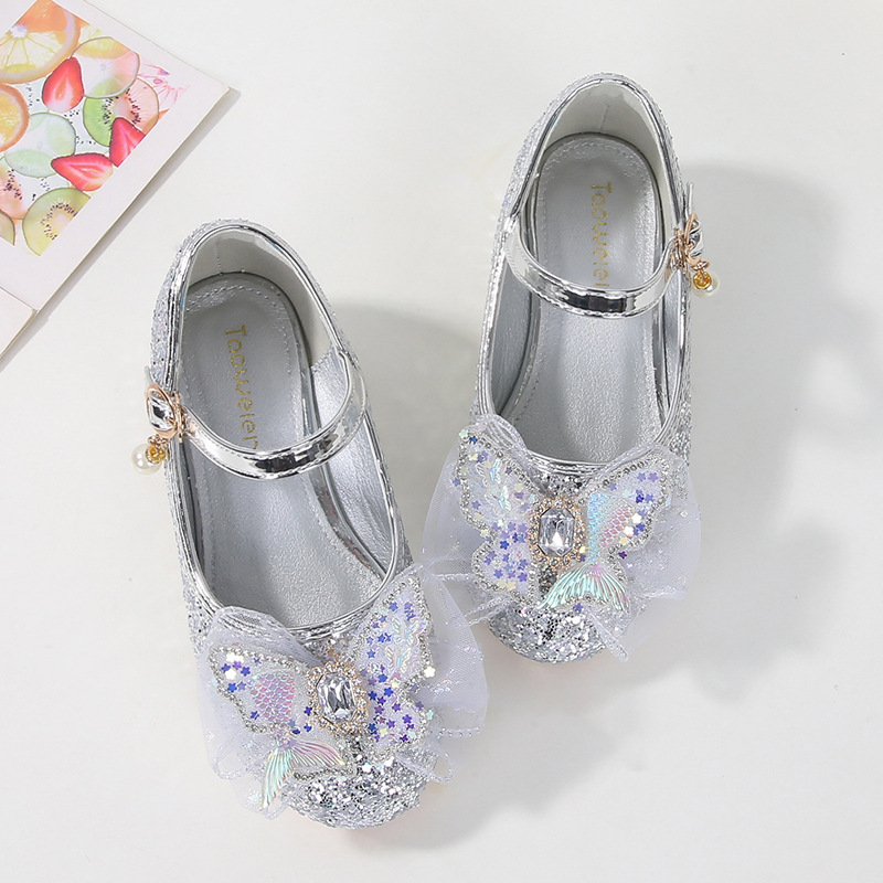 子供用ハイヒール、女の子用プリンセスシューズ、子供用革靴、春秋新作シルバーショーシューズ、ゴールデンエチケット