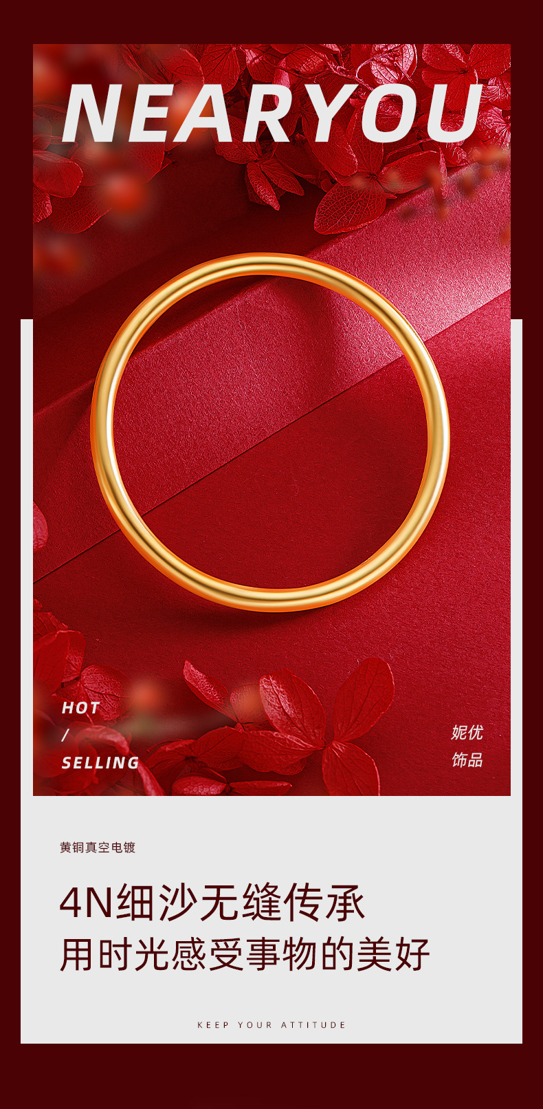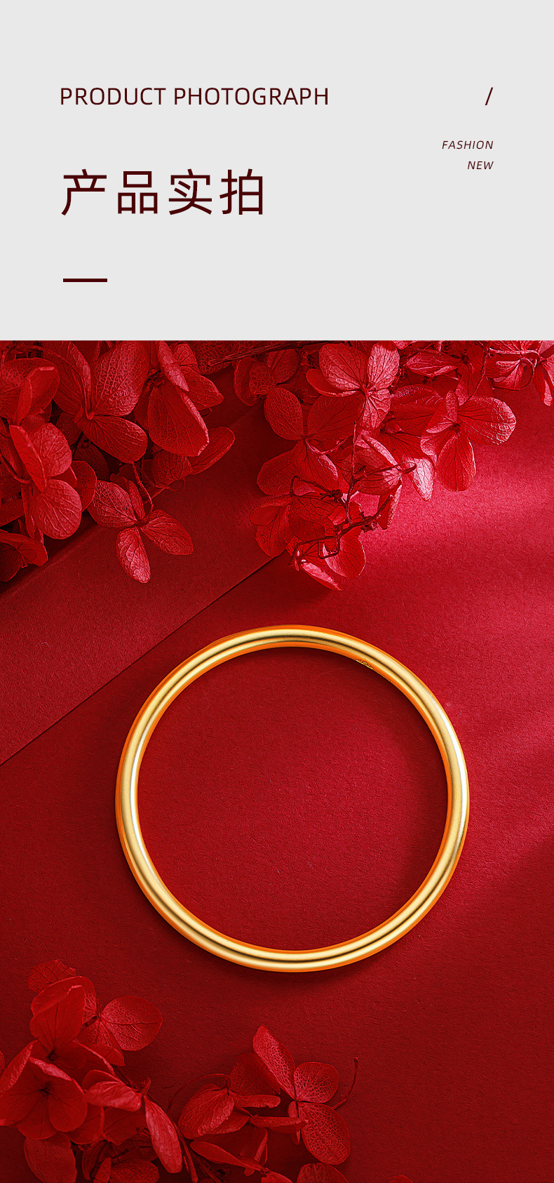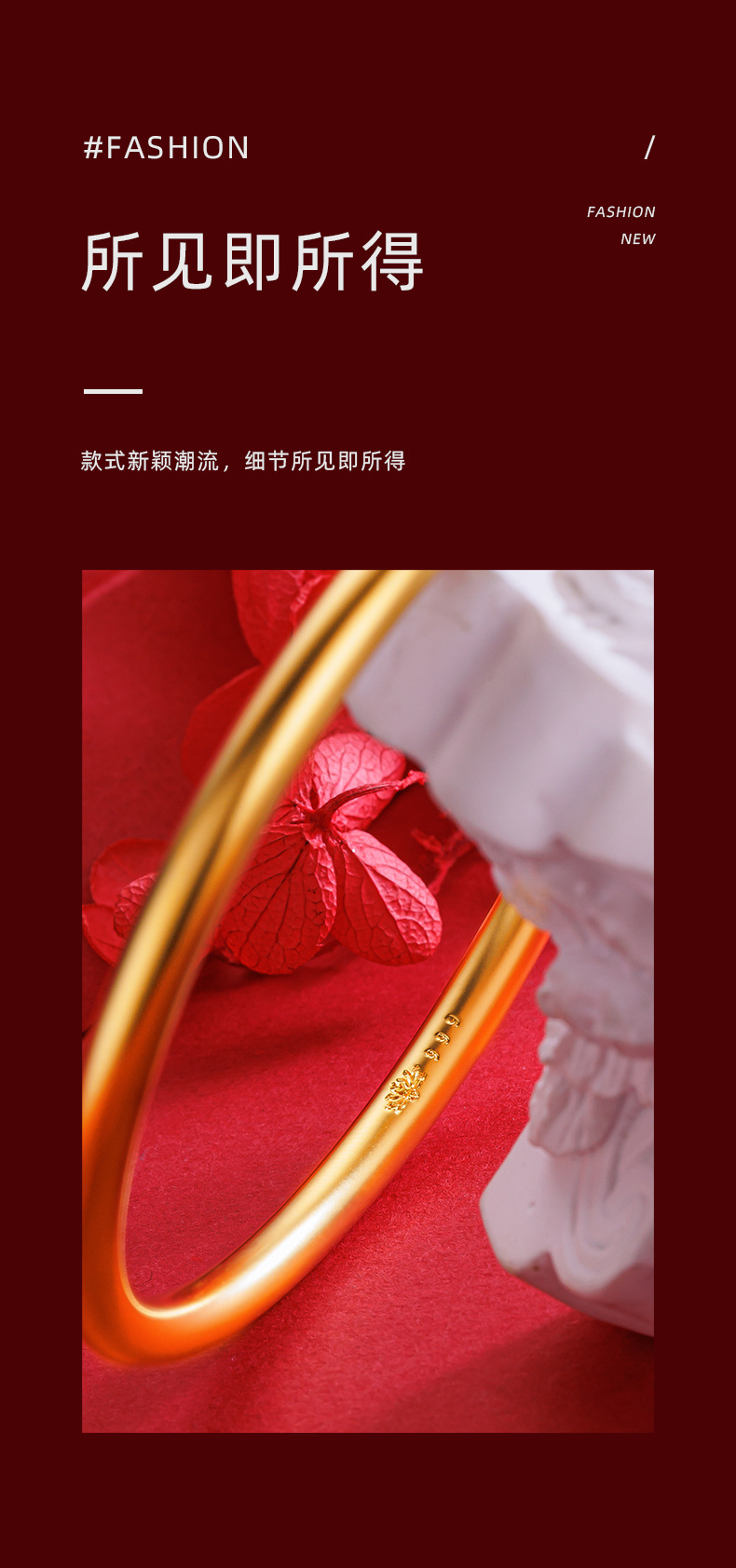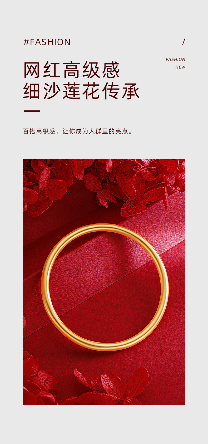 小红书周家同款古法平面四方如意素圈手镯 真空24k电镀磨砂手环女