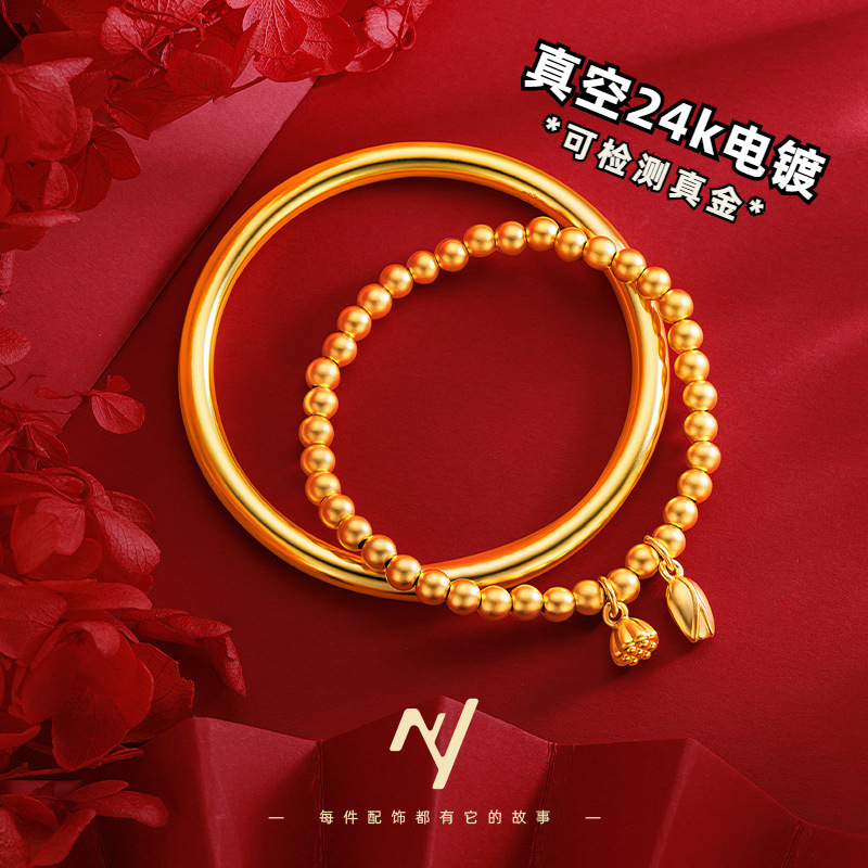 Xiaohongshu Douyin 長期的に色褪せない女性の古代伝統ブレスレットサンドゴールド真空メッキ蓮の花の伝統ブライダルブレスレット
