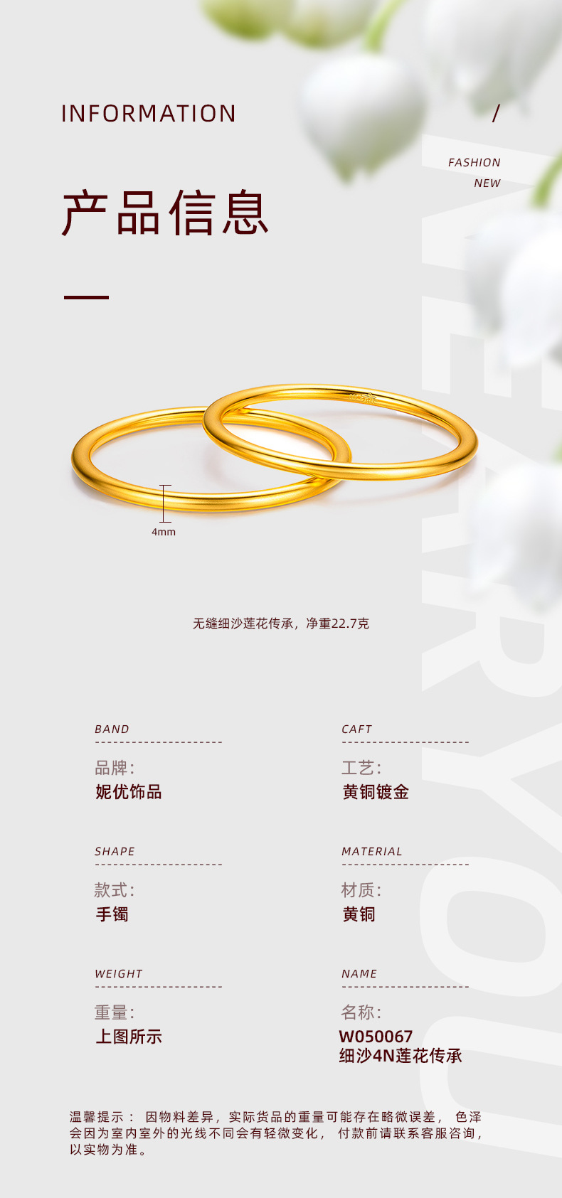 古法素輪伝承百福ブレスレット周家同金金メッキシームレス溶接明るい面7mm百福ブレスレット