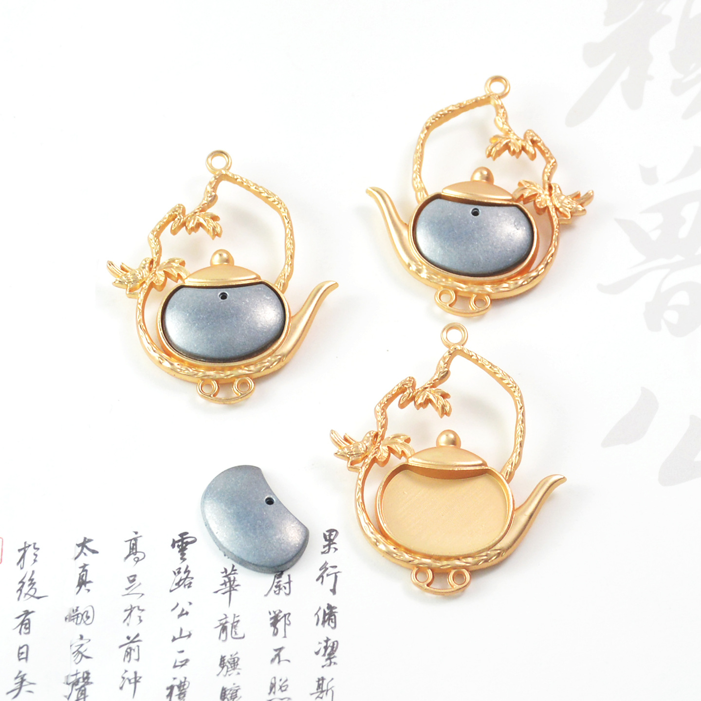 合金镶嵌茶壶宋锦双面盖diy项链服饰胸针如意锁吊坠厂家直销