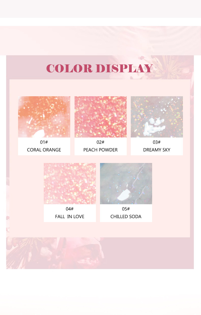 カラー 01 # coral orange,02 # peach powder,03 # ドリームスカイ,04 # fall in love,05 # chilled soda